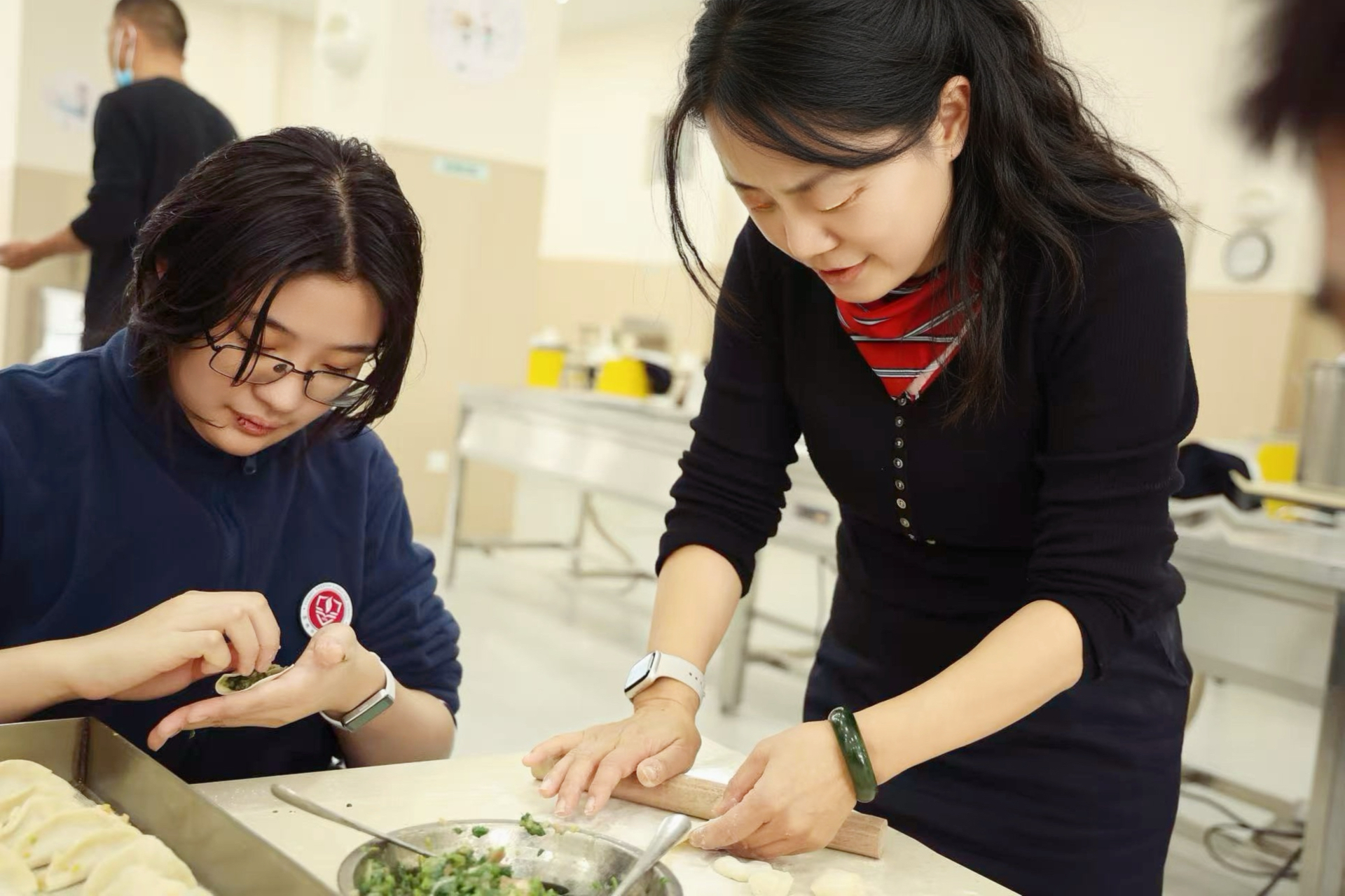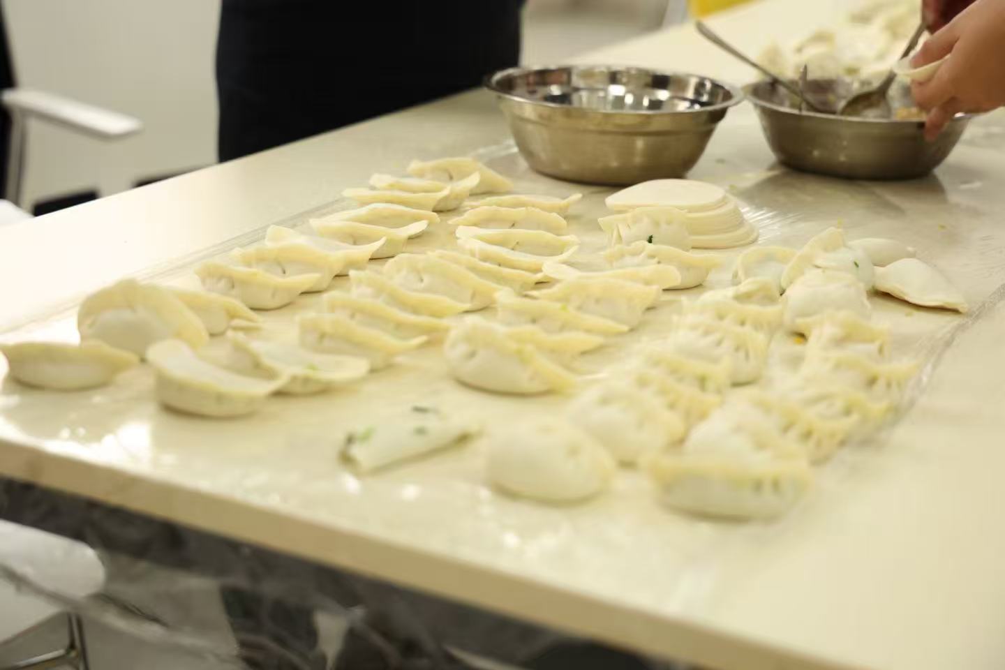 我们这群新手学得手忙脚乱,有的馅露了出来,有的皮捏不紧,家长们和老师们便耐心指导,手把手教我们擀皮、捏褶。徐老师身为“厨房达人”,饺子包的一流,样子齐美;宋老师和朱老师都有一套自己的方法,包的饺子胖嘟嘟的可爱。欢声笑语中,案板上的饺子摆满了一盘又一盘,形态各异:有点像小笼包,有的像馄饨,却满含温情——那是故乡饺子的样式和味道,更是我们一整个在一起的欢乐。大家围坐在一起,吃着自己亲手包的饺子,暖意融融,从舌尖漫到心底。除此之外,我们还煮了汤圆——无论南还是北,都共聚一堂,庆这个温暖的冬至。