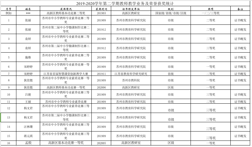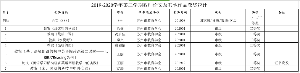 2019-2020学年第二学期教师教科研成果统计(初中)