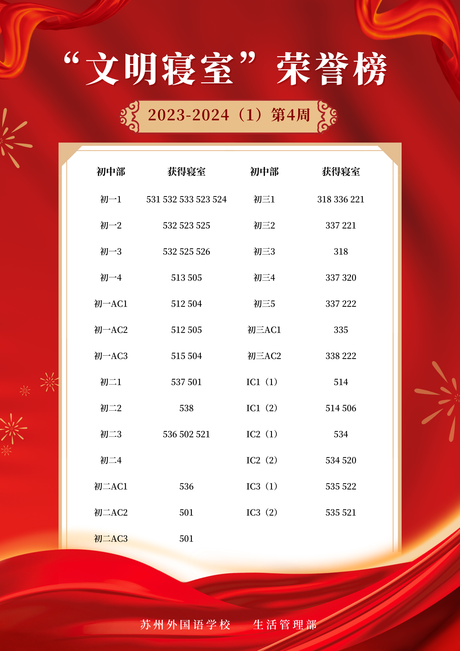 2023-2024学年第一学期第4周“文明寝室”荣誉榜
