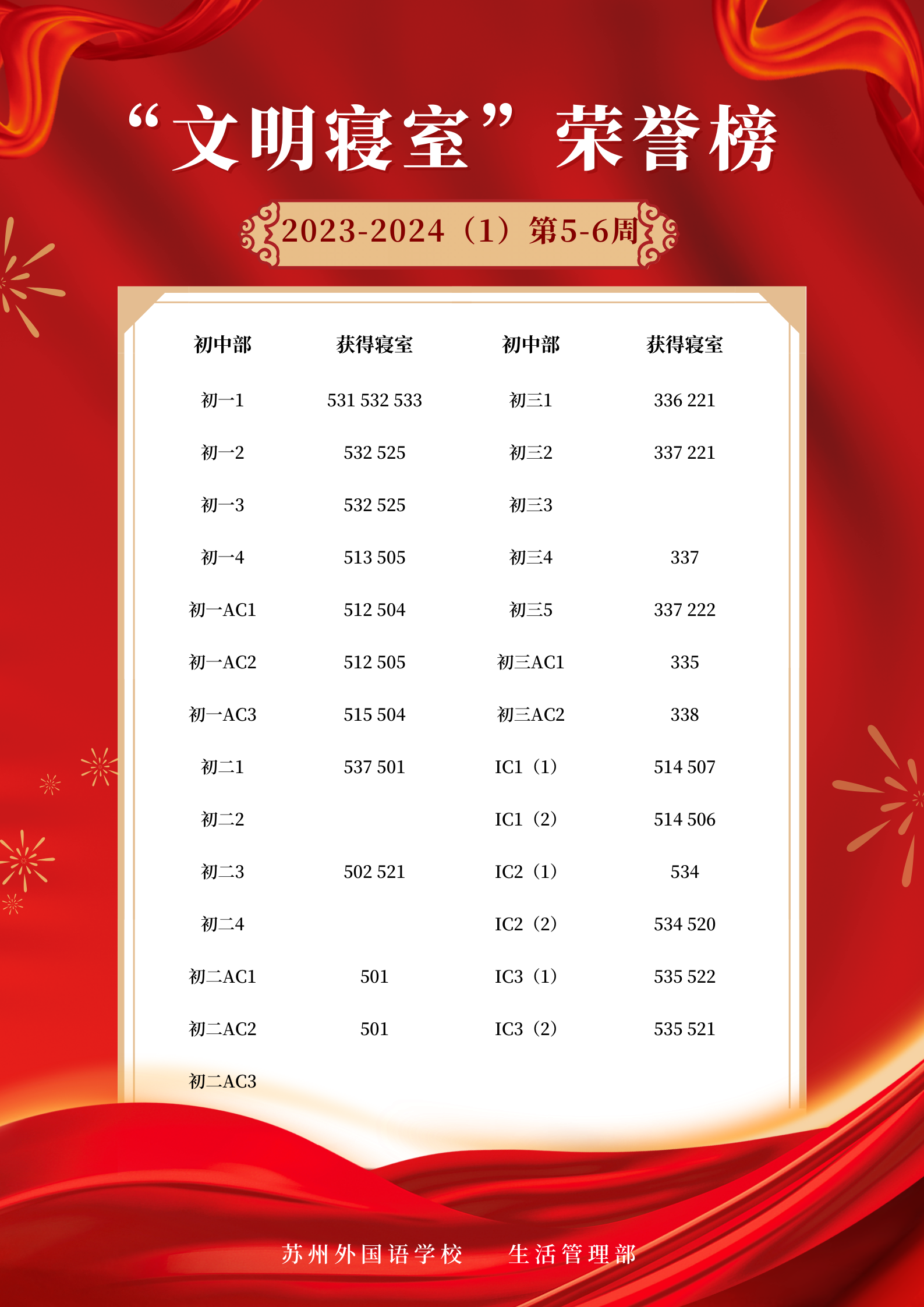 2023-2024学年第一学期第5-6周“文明寝室”荣誉榜