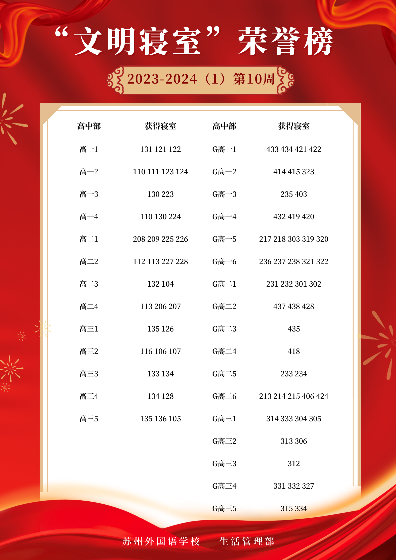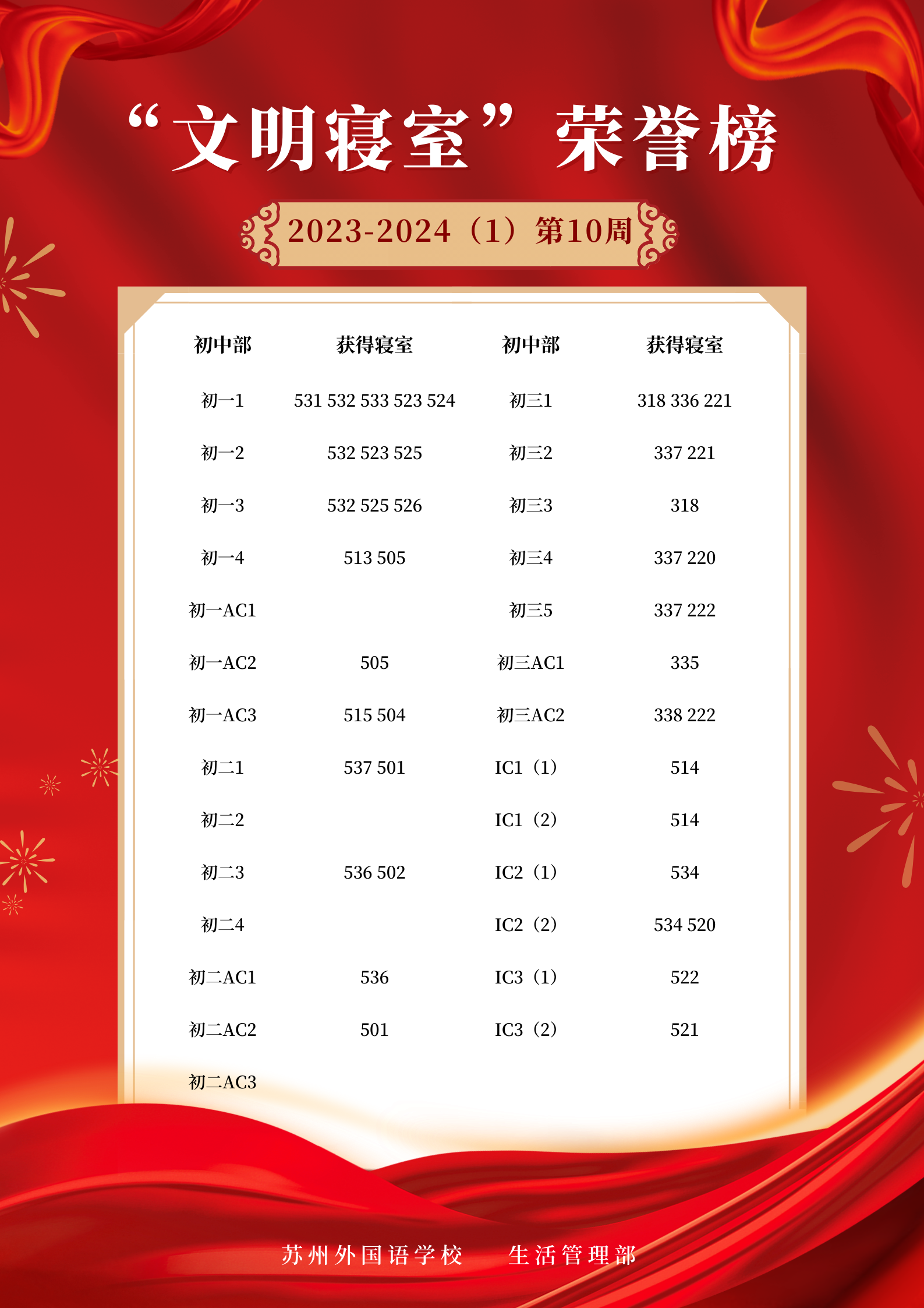 2023-2024学年第一学期第10周“文明寝室”荣誉榜