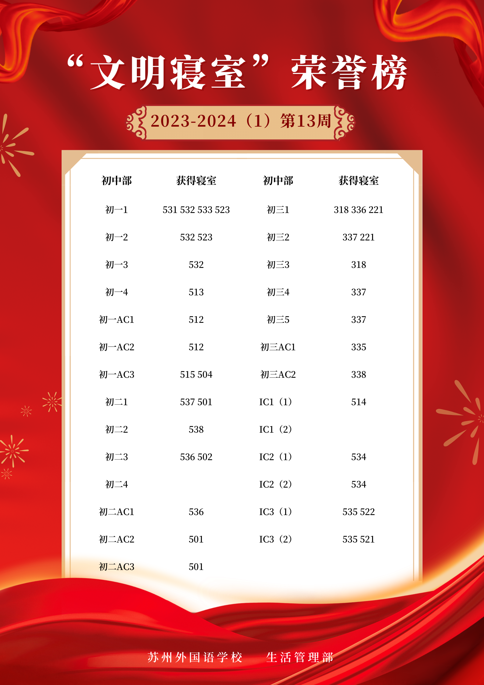2023-2024学年第一学期第13周“文明寝室”荣誉榜