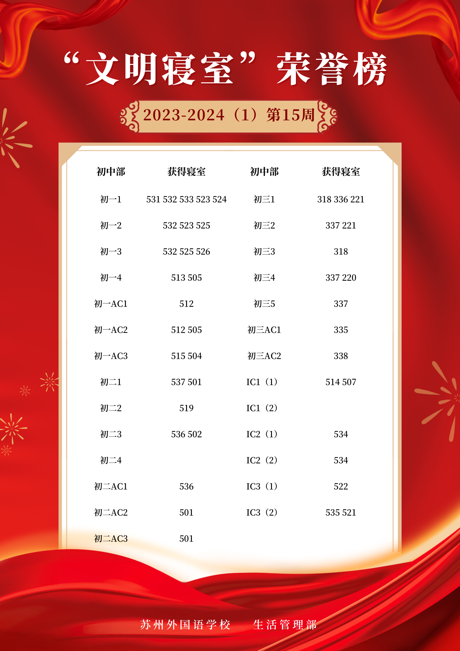 2023-2024学年第一学期第15周“文明寝室”荣誉榜