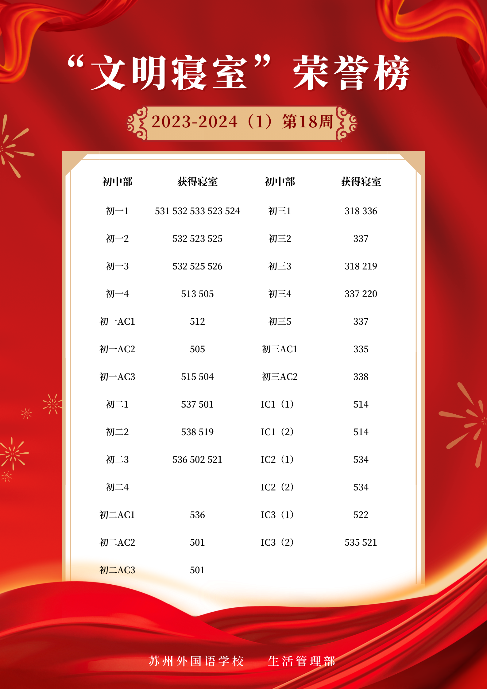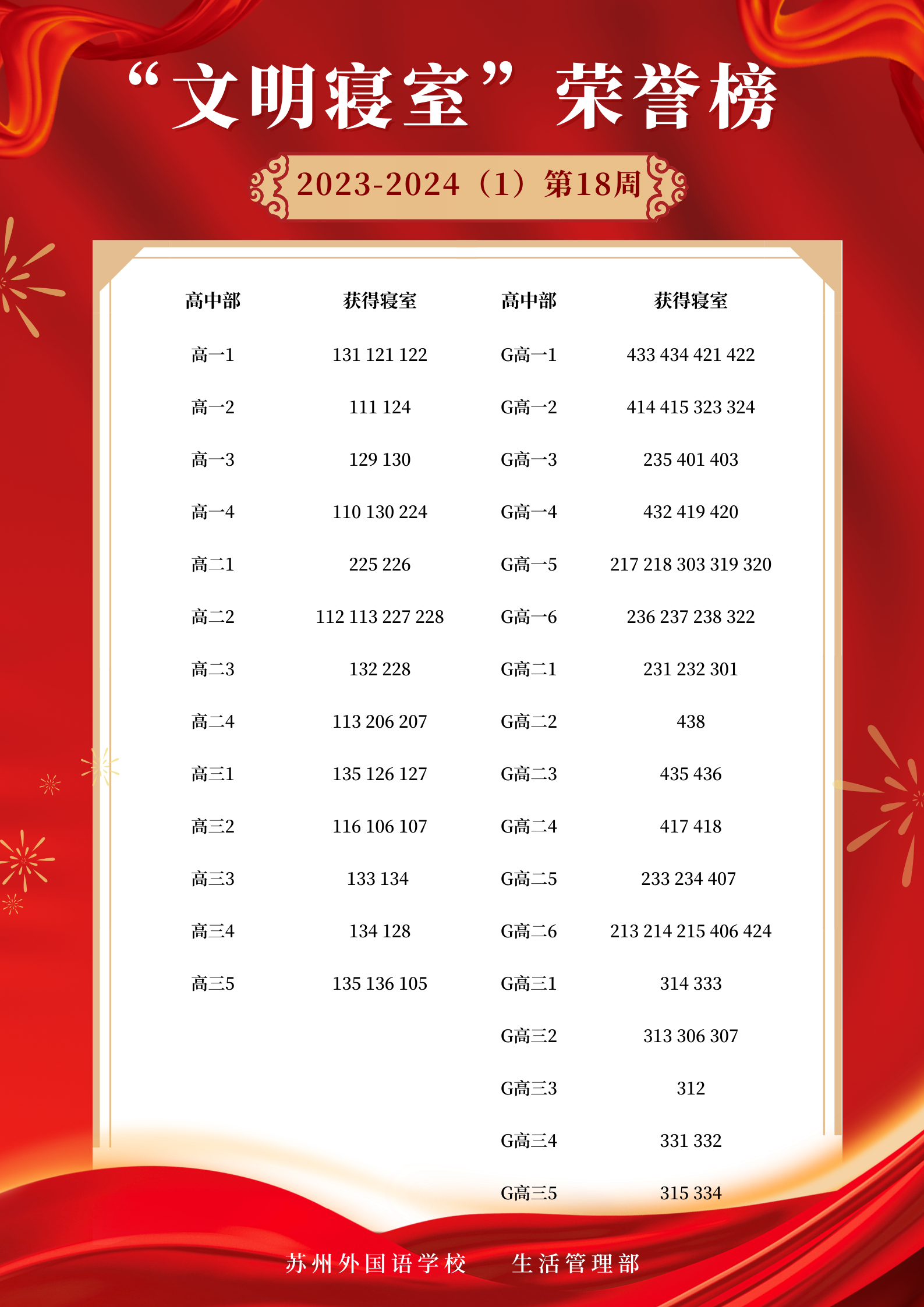 2023-2024学年第一学期第18周“文明寝室”荣誉榜