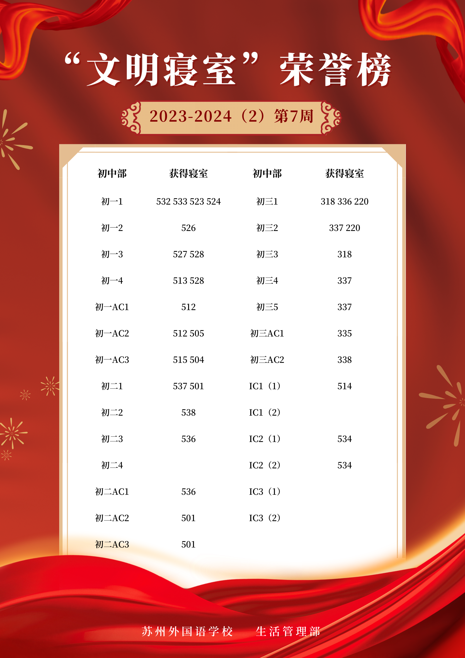 2023-2024学年第二学期第7周“文明寝室”荣誉榜