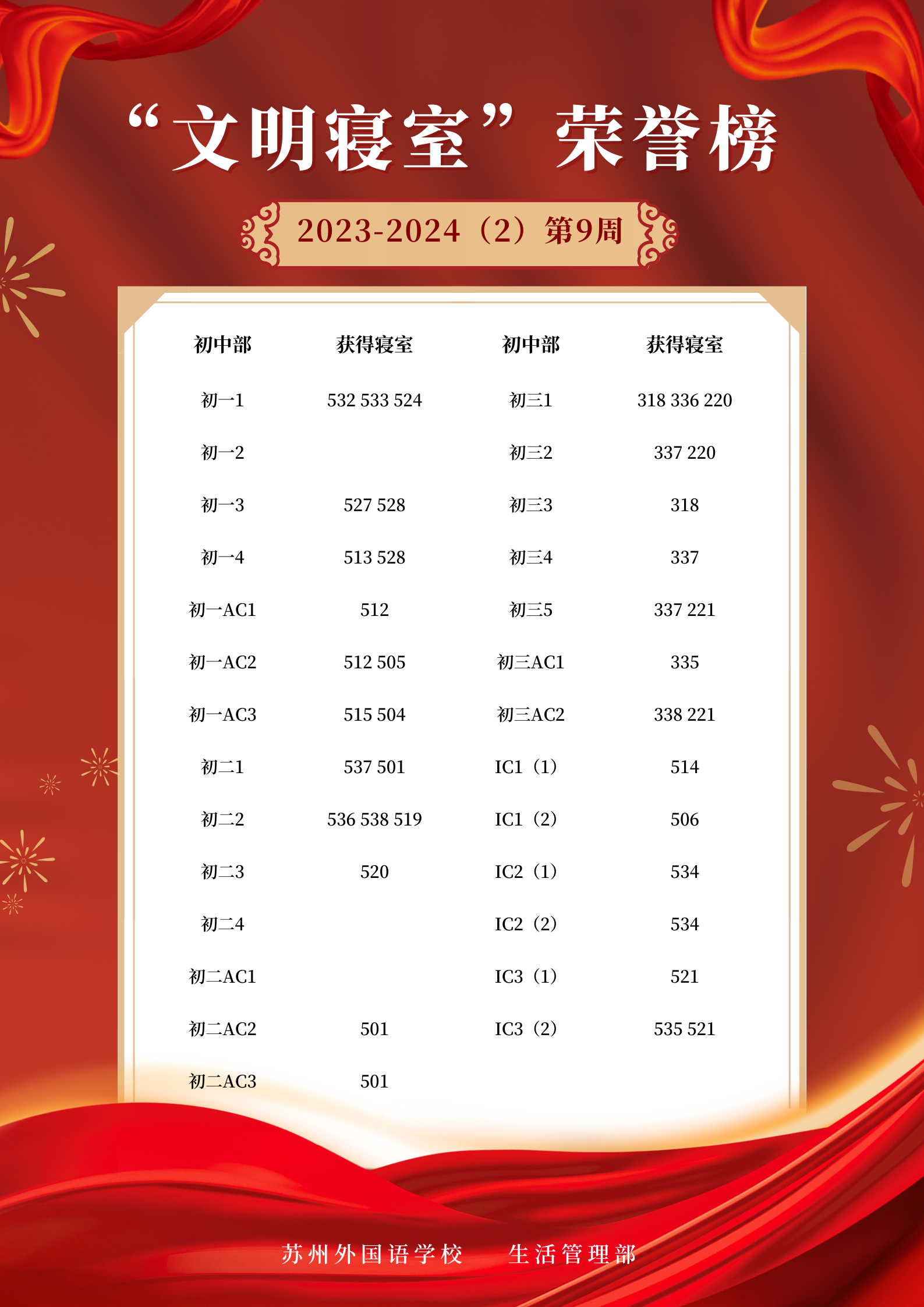 2023-2024学年第二学期第9周“文明寝室”荣誉榜