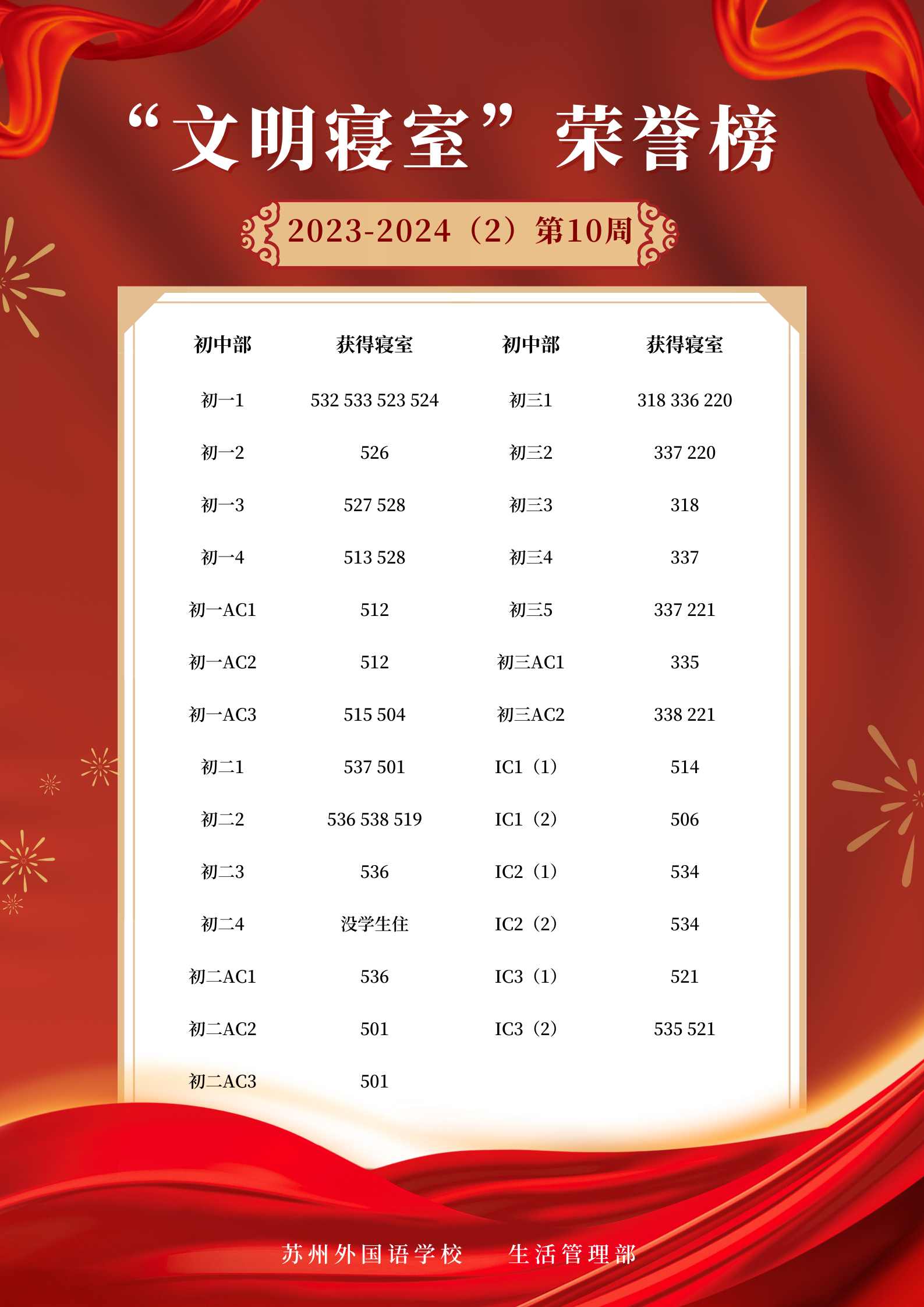 2023-2024学年第二学期第10周“文明寝室”荣誉榜