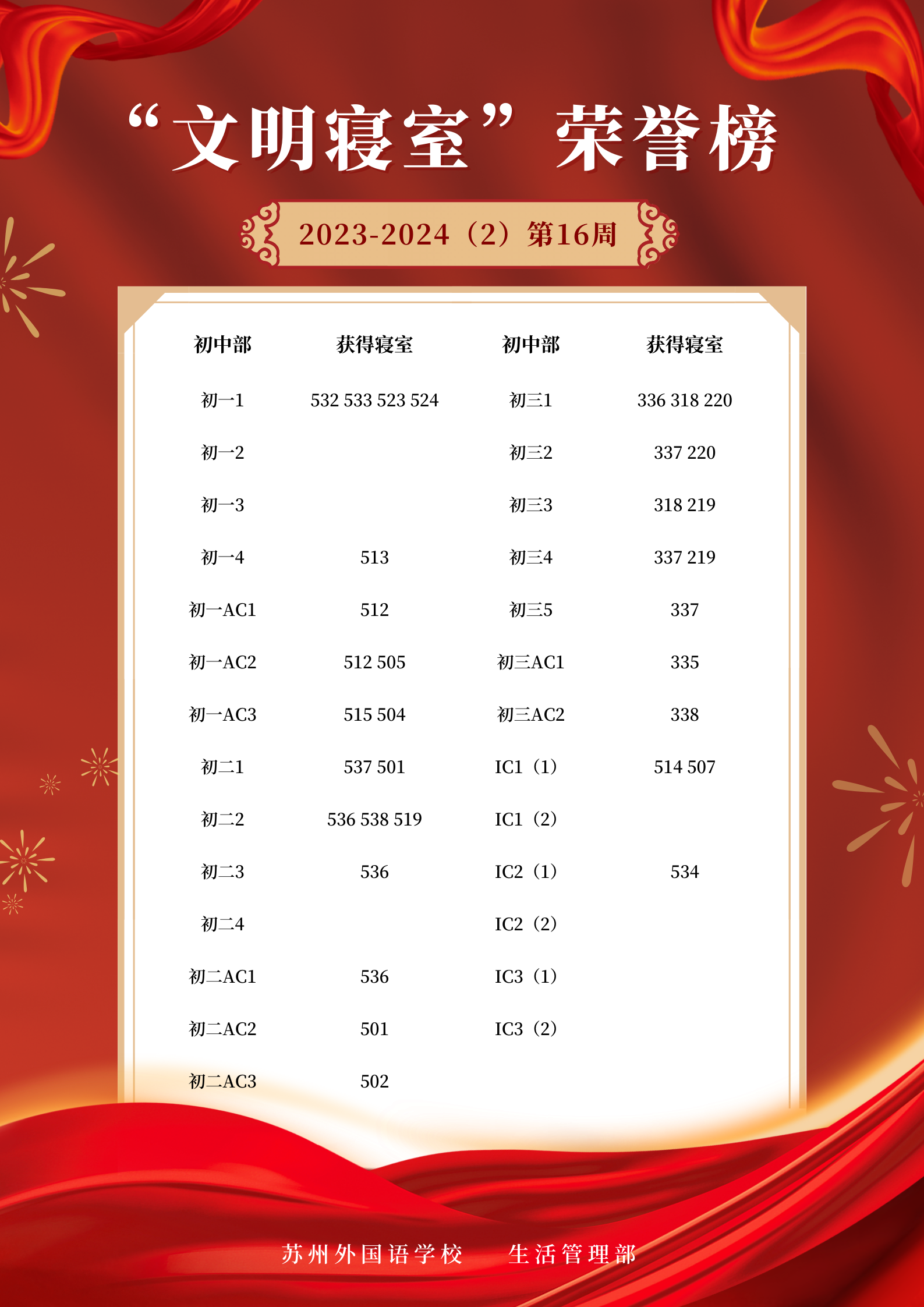 2023-2024学年第二学期第16周“文明寝室”荣誉榜