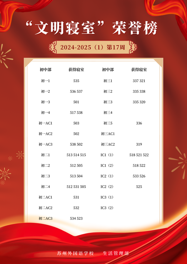 2024-2025学年第一学期第17周“文明寝室”荣誉榜