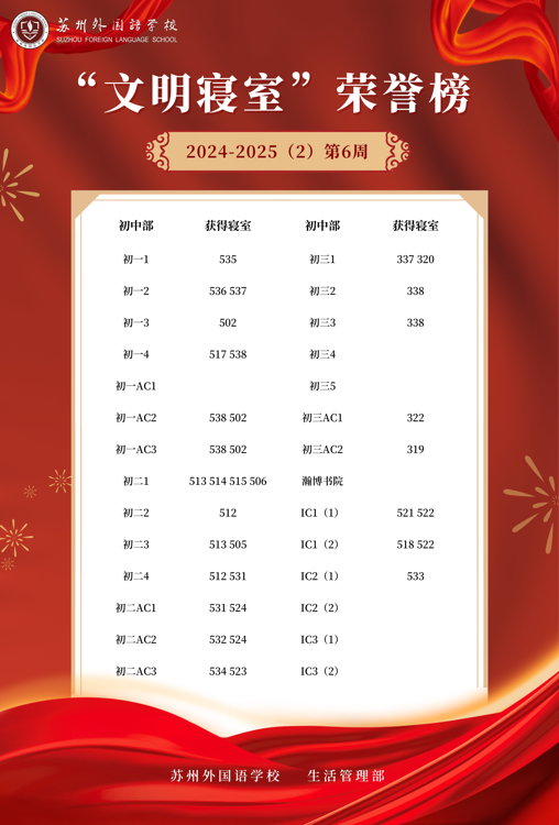 2024-2025学年第二学期第6周“文明寝室”荣誉榜