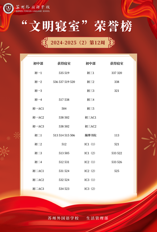 2024-2025学年第二学期第12周“文明寝室”荣誉榜