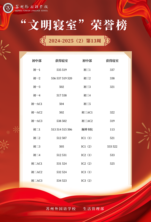 2024-2025学年第二学期第13周“文明寝室”荣誉榜