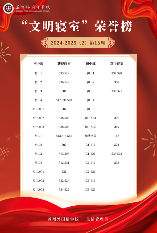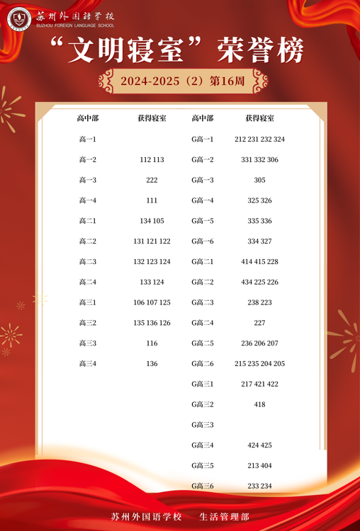 2024-2025学年第二学期第16周“文明寝室”荣誉榜
