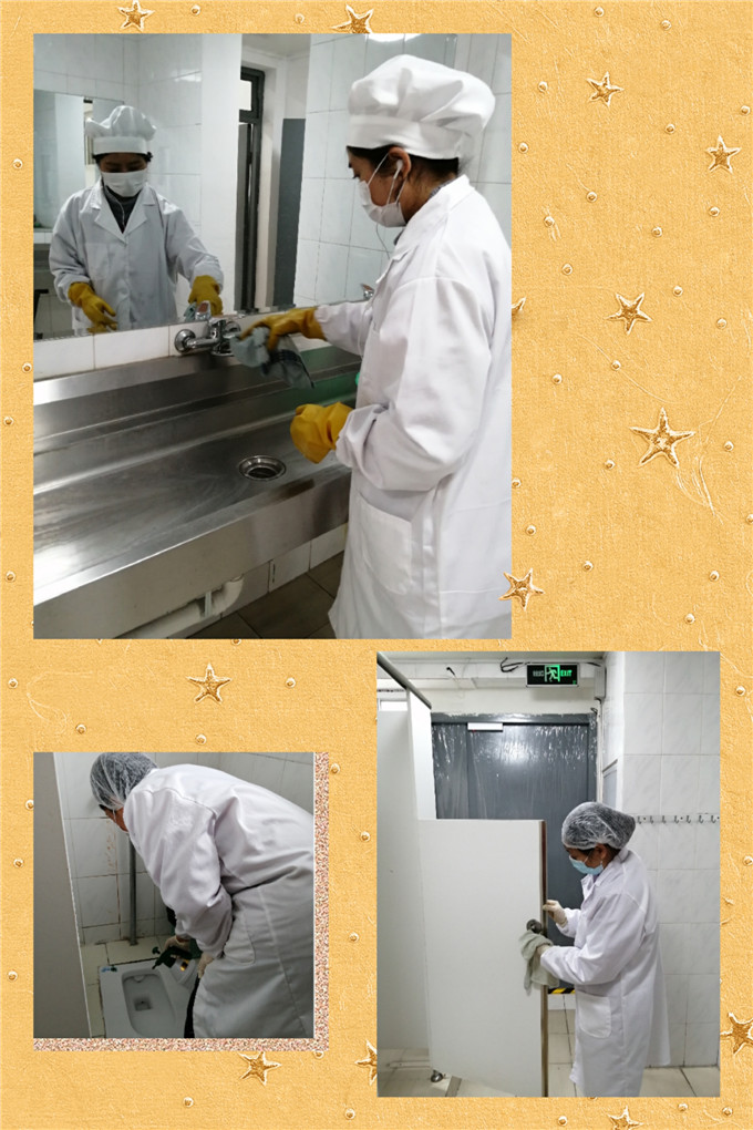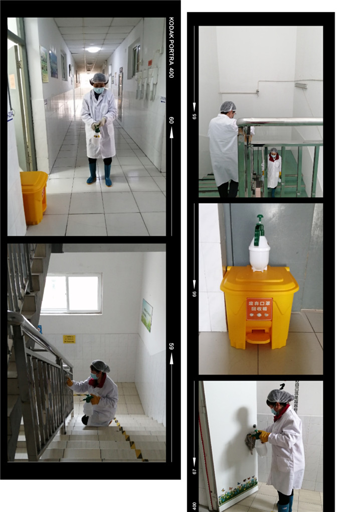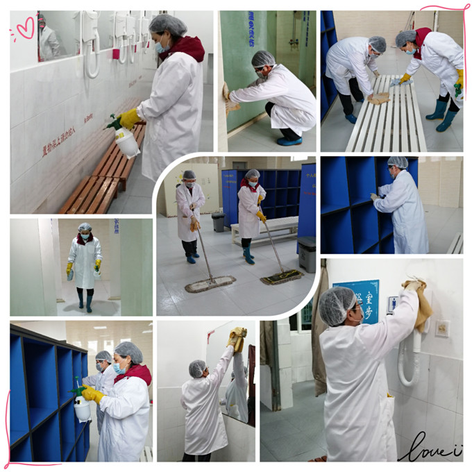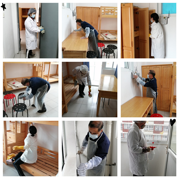 会后,大家相互讨论交流,查缺补漏,加强记忆,巩固所学。随后大家便由尤海云、余娟两位楼长安排,各就各位开始大规模的消杀清洁工作。大门口、走廊、房间、厕所、自习室、浴室……地面、门把手、楼梯扶手、开关、床、柜子桌子凳子、饮水机吹风机、浴室放衣服的柜子长凳、隔板……边边拐拐、角角落落都进行了认真细致地消毒和清洁,不放过任何一个死角。
