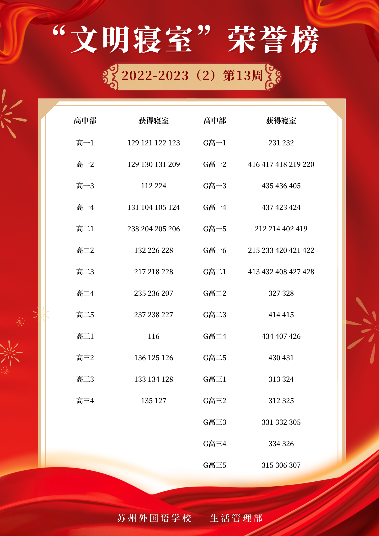 2022-2023学年第二学期第13周“文明寝室”荣誉榜