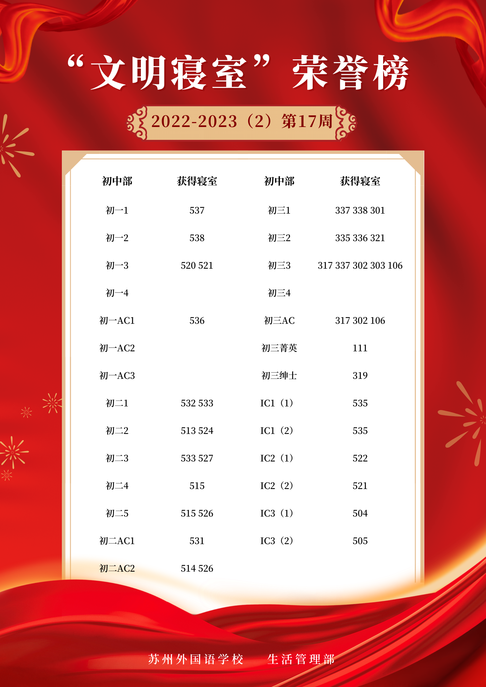 2022-2023学年第二学期第17周“文明寝室”荣誉榜