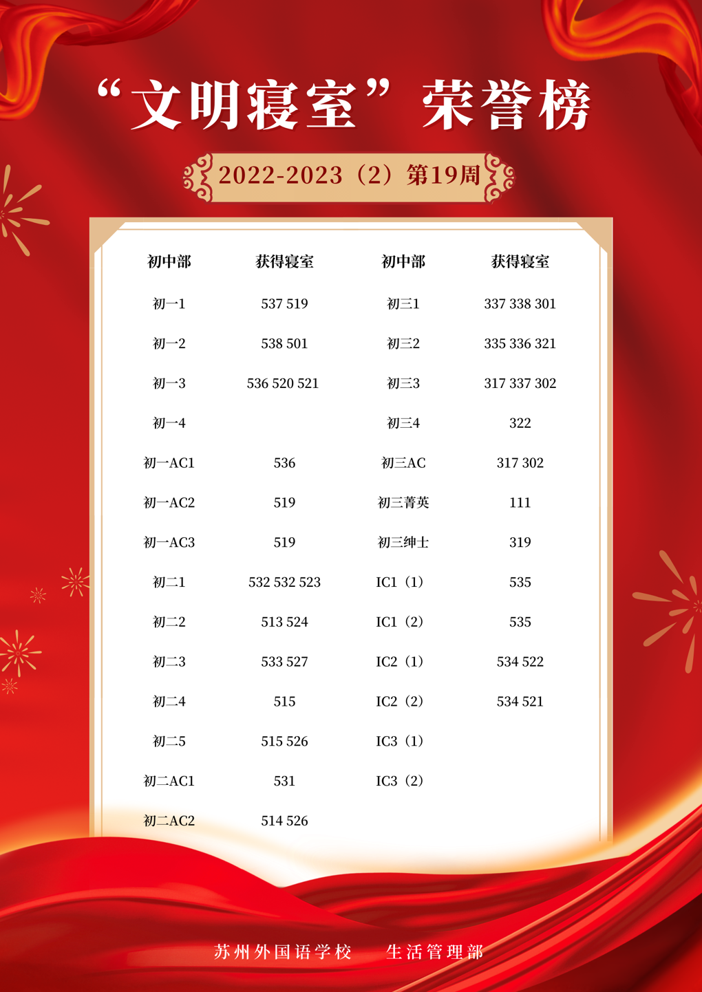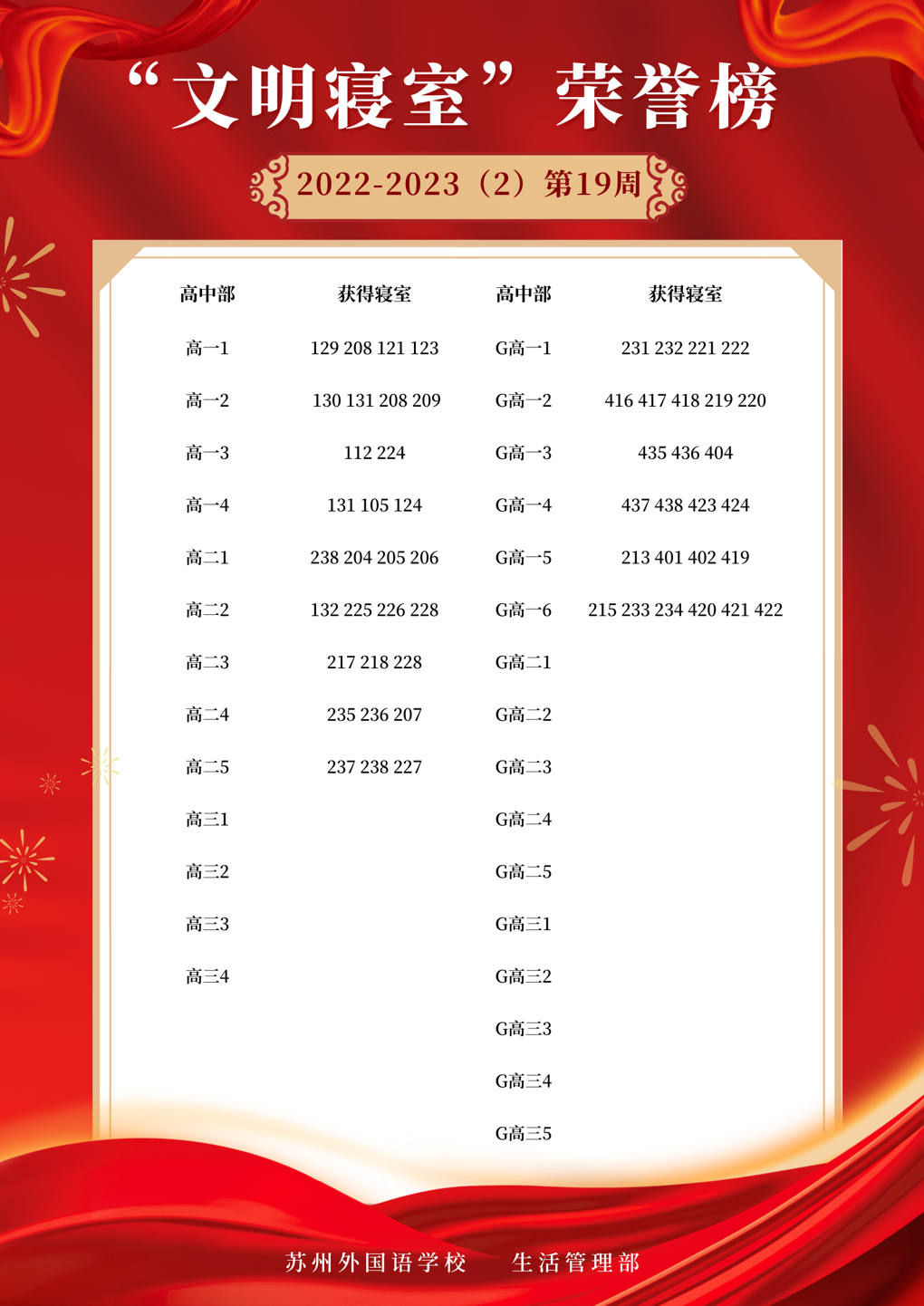 2022-2023学年第二学期第19周“文明寝室”荣誉榜