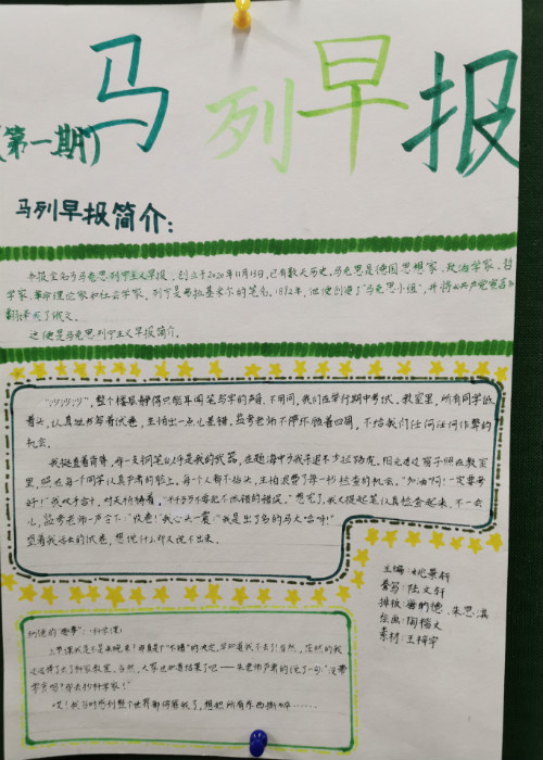“马列小组”成员率先打头阵,顶着期中考试的重压,完成了小组任务,在班上呈现了一份《马列早报》。整张小报布局清晰,版面清爽,没有华而不实图画,让人一目了然。《马列早报》中最大的亮点及特色,便是对这份小报名称的简介,可谓别具风格。美中不足的是,早报中关于班级新闻、趣闻的报道较少,也没有学习心得或者学习方法分享。另外,该小组成员分工不是特别明确。《马列早报》得到同学们的好评,小组成员也接受了老师的指点。