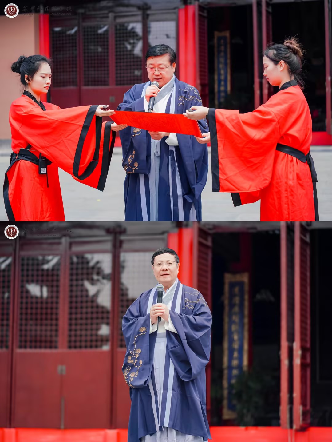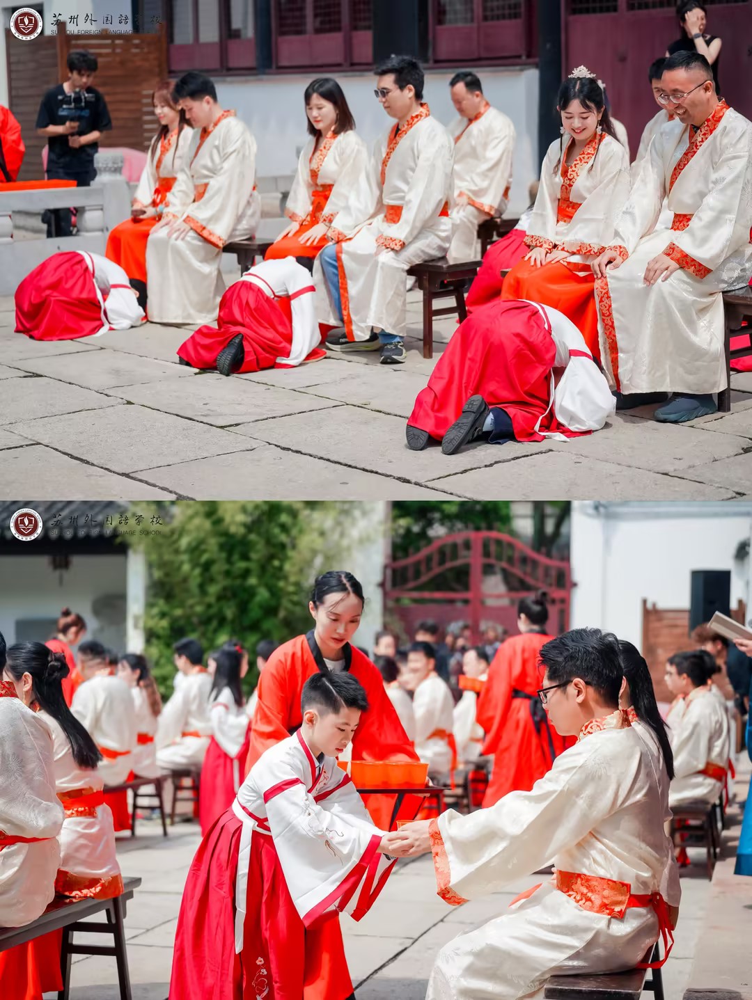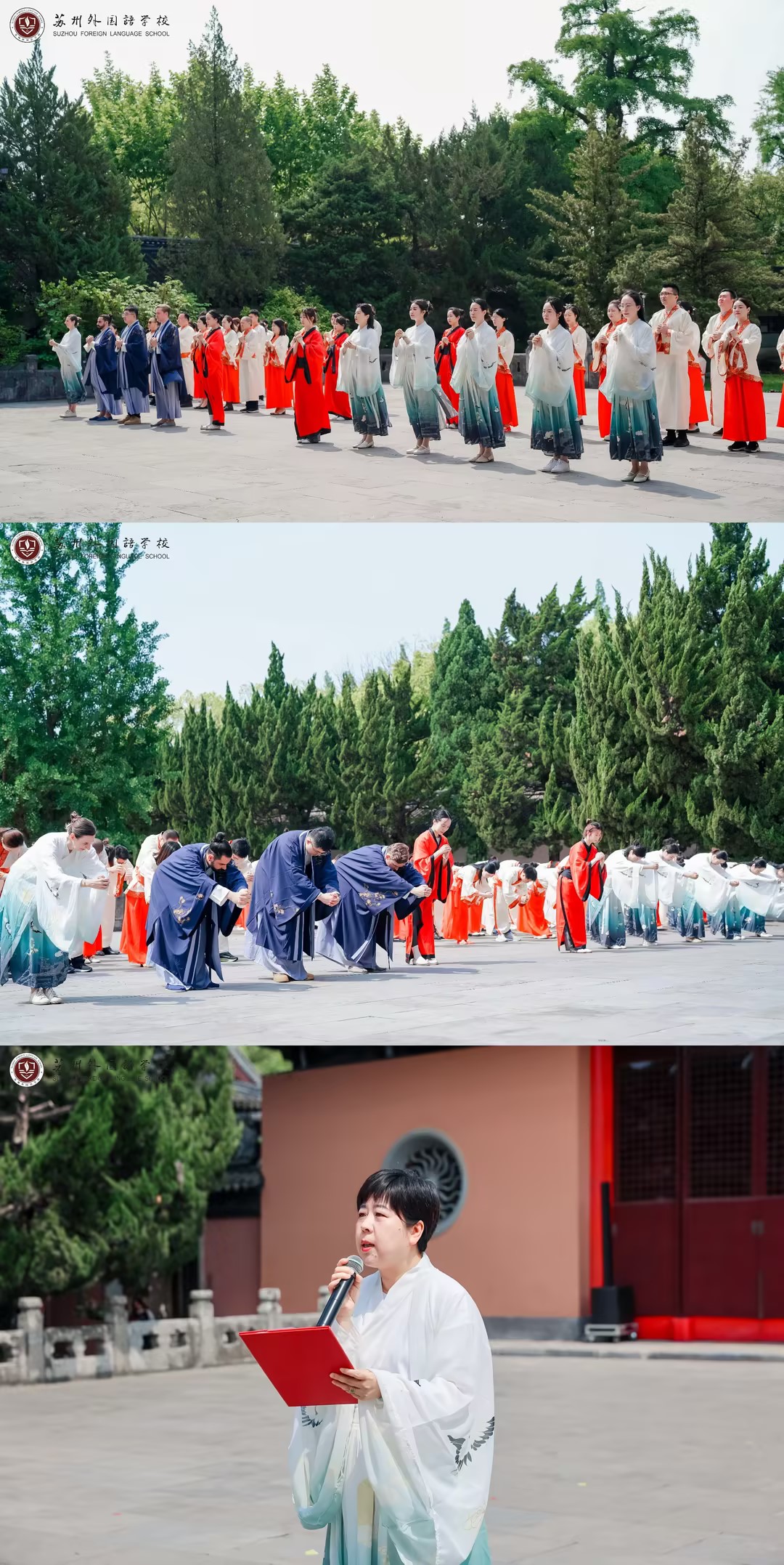 庄严肃穆的文庙内,在场者一起高唱国歌,致敬中国共产党。赞者宣读成长礼诰文,老师们敬拜大成至圣先师——孔子,以表师道传承,学生们礼拜老师,感念师恩。苏州外国语学校副校长陈黎女士对学生进行训导。