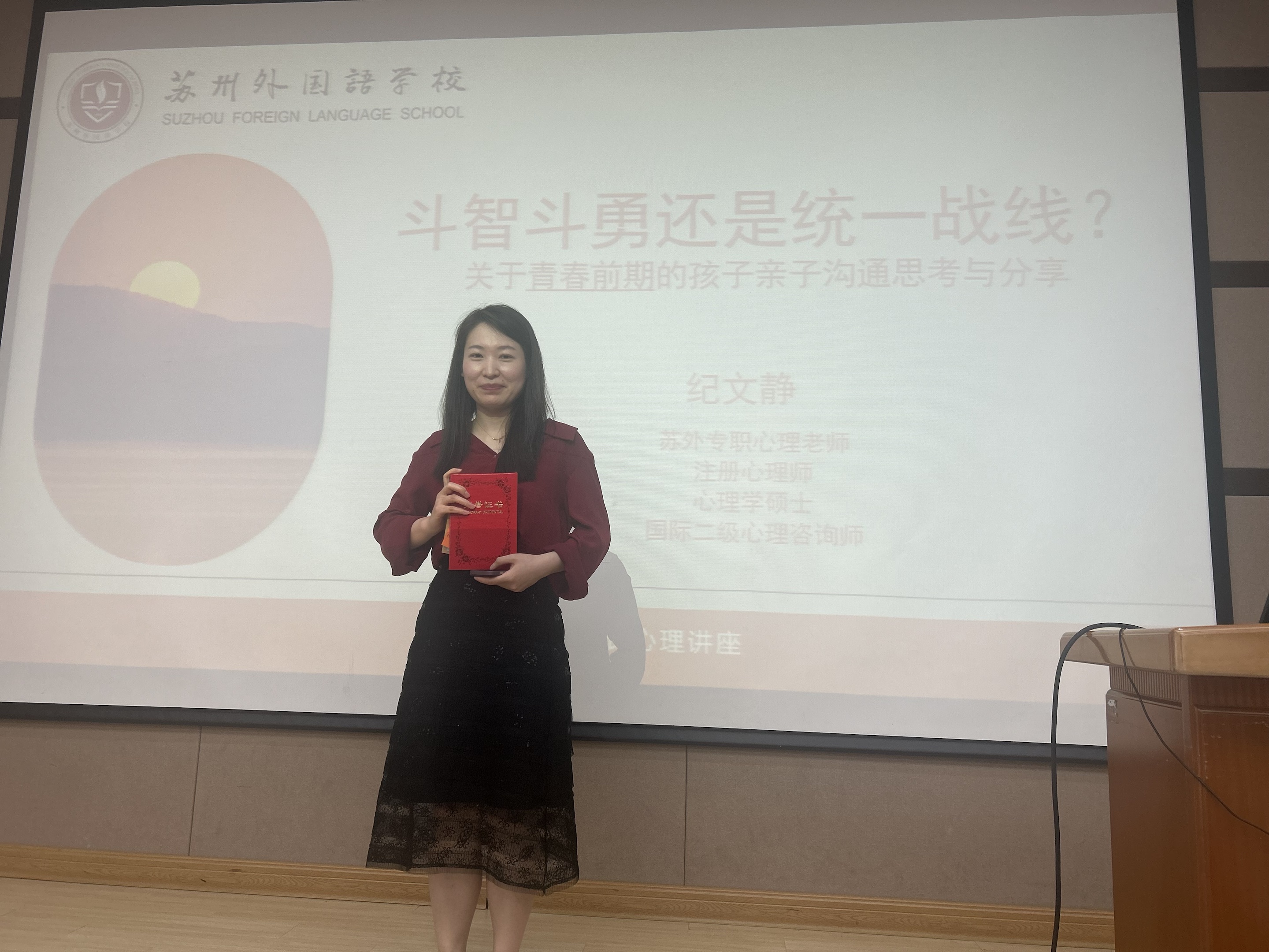家长半日活动的第一个议程是一场非常专业的家庭教育心理讲座,主讲人纪文静老师(苏外专职心理老师,心理学硕士,注册心理师,国家二级心理咨询师,苏州市中小学心理健康教师)的讲座主题是:良性陪伴,有效进行亲子沟通,这一话题非常契合小学高年级即将进入青春期的孩子们的心理状态,也是家庭教育亟待关注的亲子问题。纪老师真诚的教育情怀和睿智的教育理念博得了家长们的阵阵掌声。