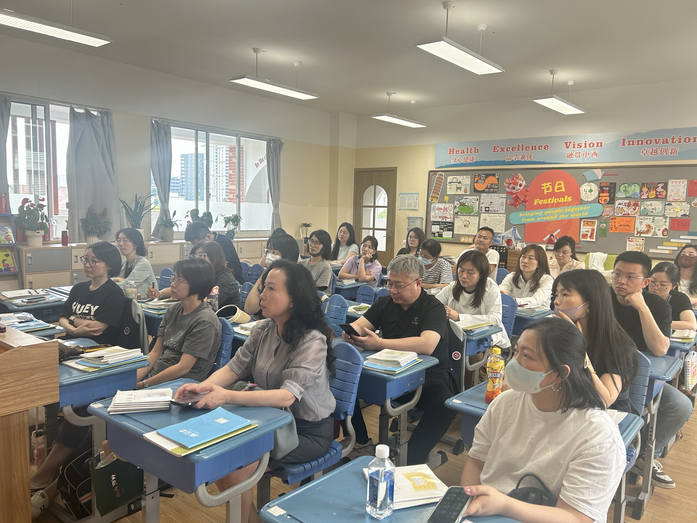 外教老师详细介绍了本学期的重难点以及家长们可以如何帮助学生拓展思维。中方英语老师侧重于语法和写作的指导,提醒家长们如何面对和辅导同学们培养细致的做题习惯。数学老师则展示了高年级数学的学习方法和优秀的草稿本与错题本。班主任及语文老师也结合教材阐述了高年级语文的学习重难点,指导家长关注学生的预习、复习习惯和习作、阅读方法等。