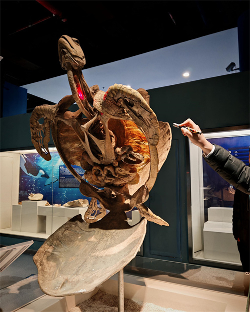 这座占地 7500 平方米的博物馆,犹如一座神秘的知识殿堂,吸引着同学们好奇的目光。一进入“海洋之魂”展厅,同学们仿佛置身于深邃的海洋世界。鲸鲨、翻车鱼、长尾鲨等鱼类和哺乳类动物的标本栩栩如生,尤其是世界上首只被保存为透明切片的海豚标本,让同学们能够直观清晰地看到其内部结构,大家不禁为这神奇的展示方式而惊叹。