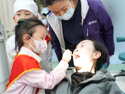 在学习了与口腔相关的知识后,小朋友们最喜欢的口腔检查环节开始了。在医生专业指导下,小朋友们使用诊疗设备认真地为家长检查口腔,了解牙齿疾病危害以及如何正确预防。
