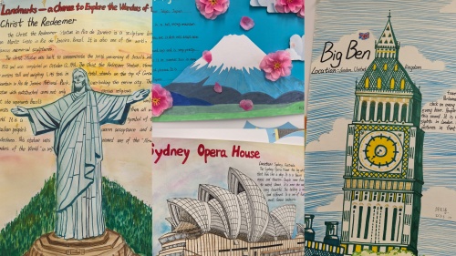 绒板上的小报,就是这些旅程的“浓缩版”。孩子们的作品各有巧思:有的用彩铅细致勾勒出富士山,用英文标注“Mount Fuji, a symbol of Japan”;有的把成都火锅、糖画图案贴在小报上,并配文:“宽窄巷子的盖碗茶,喝起来有点甜”;画着兵马俑的小报上,工工整整抄着“世界第八大奇迹,太壮观了!”;更有孩子把舟山的海景照片打印下来贴在小报上,用双语写下“Zhoushan's sea is blue, and the sunset is beautiful”。每一张小报都像一扇小窗户,透过色彩和文字,能看到他们旅行中的好奇与收获。