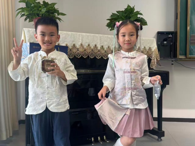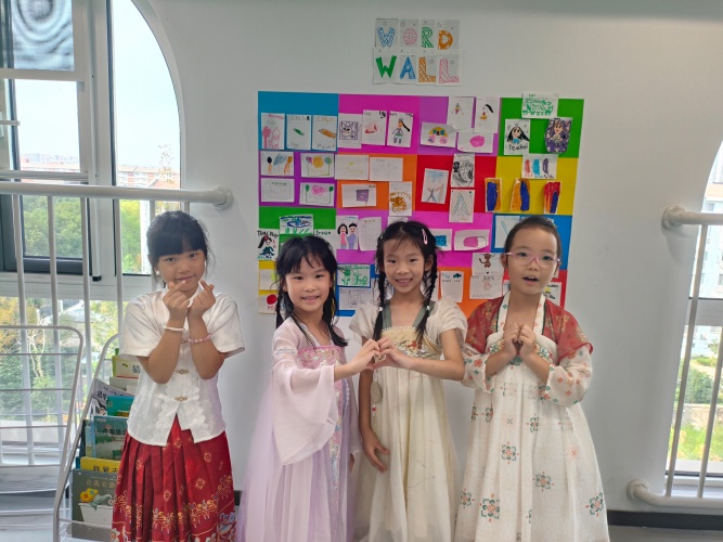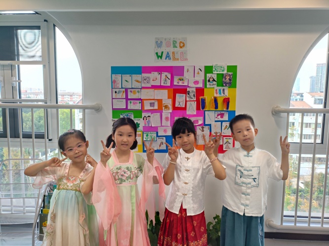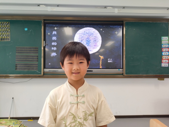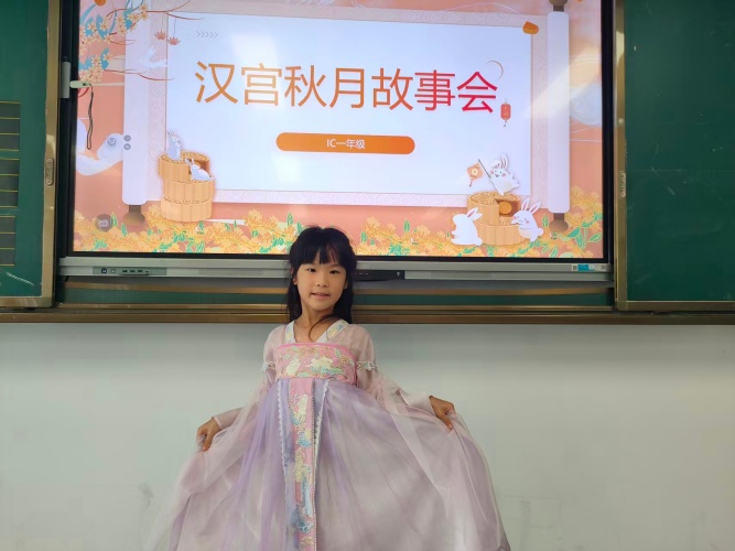 走入小学IC一年级的教学长廊,恍若穿越回了古代,一群身着汉服的小小身影穿梭其间。女孩们衣袂飘飘,宛若月宫仙子;男孩们气宇轩昂,好似谦谦公子。中秋节的欢乐氛围在五彩的裙袂间流动,在悦耳的欢笑中回荡。