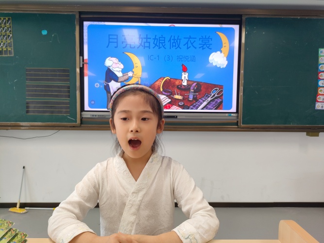 在故事会的舞台上,一年级的小不点们化身为故事小达人带来了一个个精彩绝伦的故事。当《嫦娥奔月》的经典故事被稚嫩却真挚的声音重新诠释,那份跨越千年的凄美让在场每个人都为之动容;《猴子捞月》的诙谐演绎引得满堂欢笑,孩子们活泼的表演让传统故事焕发新生;《月亮的味道》则带领大家展开想象的翅膀,开启了一段奇妙的探月之旅。最令人难忘的,是悦涵小朋友带来的《月亮姑娘做衣裳》。她声音婉转,娓娓道来,丰富的表情让月亮姑娘仿佛就站在眼前,整个会场安静得只听得到她讲述的声音,所有孩子都睁大了眼睛,沉浸在神奇的月亮世界里。