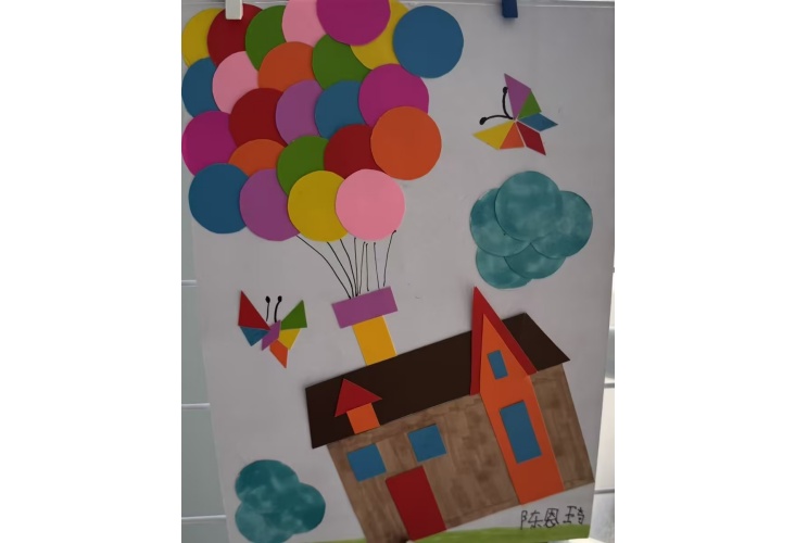 而无论梦想飞得多远,家永远是温暖的港湾。孩子们用一个大正方形做墙体,一个标准的三角形做屋顶,再配上长方形的小门和正方形的窗户,一栋栋充满童真的小房子便跃然纸上。利用圆形做气球,童话里的飞屋环游也来了。
