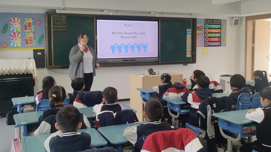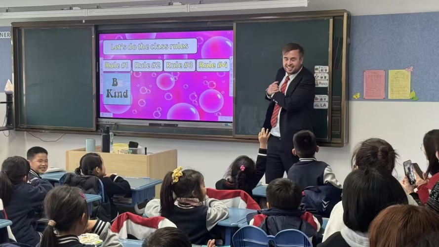 紧接着,外教老师带来了活泼幽默的外语课堂。他们通过歌曲、游戏与丰富的肢体语言,瞬间点燃了孩子们的热情,营造出纯英文的沉浸式环境。孩子们在“玩中学,学中用”,毫无拘束地一起互动,自信地开口表达,课堂气氛热烈非凡。
