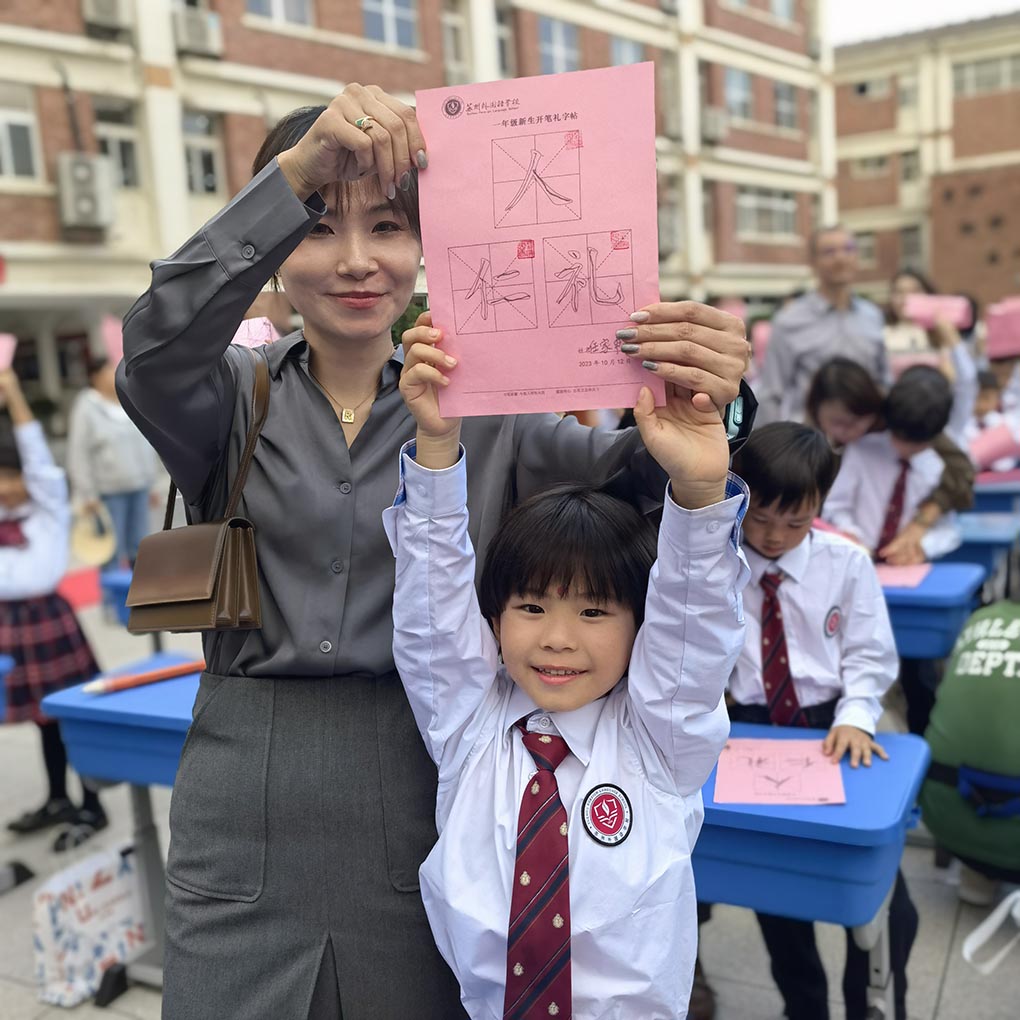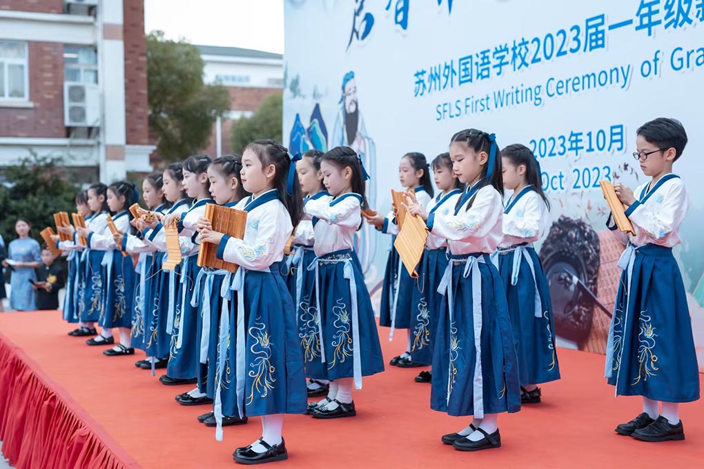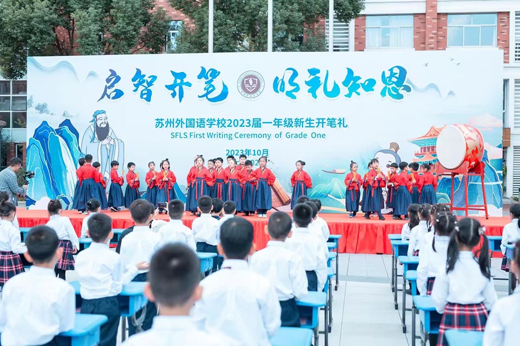 沐金风,杏坛铺锦绣;育清韵,学子谱新篇。时值金秋,苏州外国语学校小学一年级萌娃们,身着正装校服,在家长们的牵手下走过启智门,齐聚礼仪广场,开启求学之路的首件大事——开笔礼!