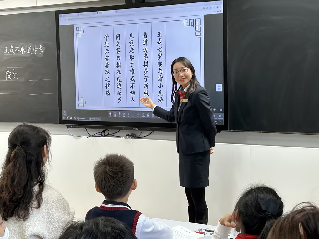 秦菊芳老师在国际楼的智慧课堂执教了一堂精彩的语文课《王戎不取道旁李》,精心设计学习任务单,在课堂进行智慧笔作答当场采集学习数据。课堂围绕三个学习任务展开:读好一则短小古文,讲好一个智慧故事,认识一类少年俊杰,体现了高效、扎实、有品的苏外语文课堂。在课堂上。秦老师设计了几个精彩环节:朗读环节,通过不同形式的朗读训练,10分钟内让学生达到当堂背诵并默写。当学生在任务单用智慧笔进行作答时,家长通过智慧投屏可以即刻看到全班孩子作答情况,可以及时发现自己孩子当堂掌握知识的能力。给父母讲故事环节:在掌握并理解文意的基础上,学生加入想象绘声绘色说故事,家长通过这个环节可以发现孩子的听课效率和输出能力。和父母同读小古文《王戎观虎》环节,家长可以及时看到孩子在课堂上学习小古文的能力迁移情况。家长称:“没想到,小古文还能这么上!这是一节课可品读、有品质、耐品味的苏外语文课”。