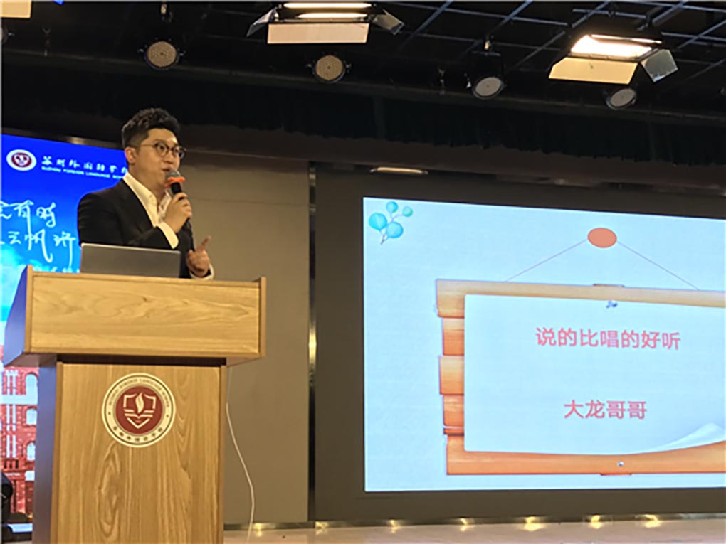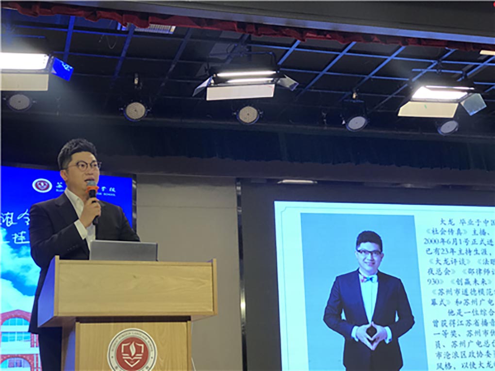 正值苏外一年一度的艺术节,三年级组有幸邀请到苏州电视台著名的节目主持人大龙,给孩子们带来了一场生动有趣的讲座——“说的比唱的好听”。