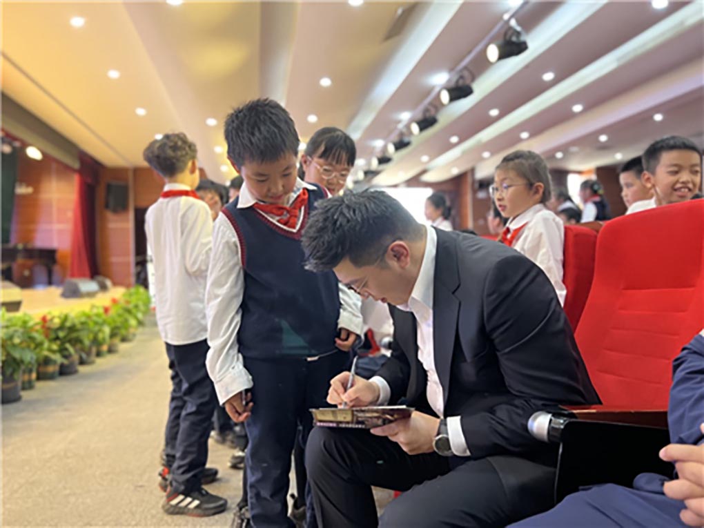 最后,大龙用声情并茂地给孩子们朗诵了一段,用实力说明了一切,孩子们激动不已,纷纷要求大龙哥哥签名,现场气氛到达高潮。