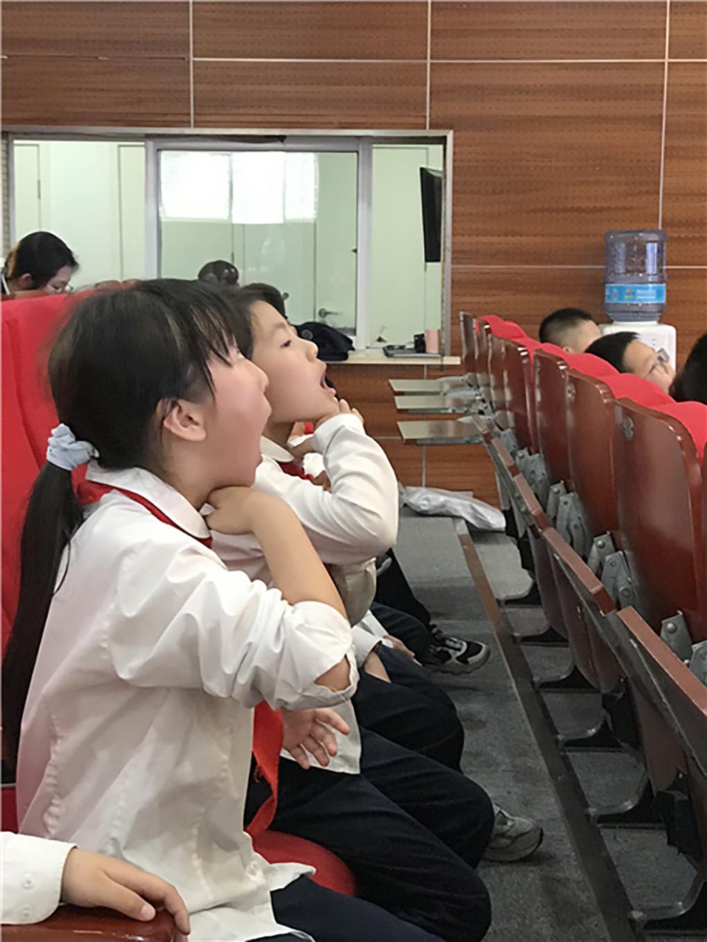 一开始,大龙就带着孩子们先做了脸部的准备活动:松下巴、提颧肌、半打哈欠,大家这才知道,原来在正式发言之前,脸部的准备活动也非常重要,因为脸部的表情可以让语言更有表现力。孩子们感到好奇有趣,现场气氛非常活跃。接着,大龙用不同的语气来表现不同的情景,孩子们欢呼连连——专业的就是棒。