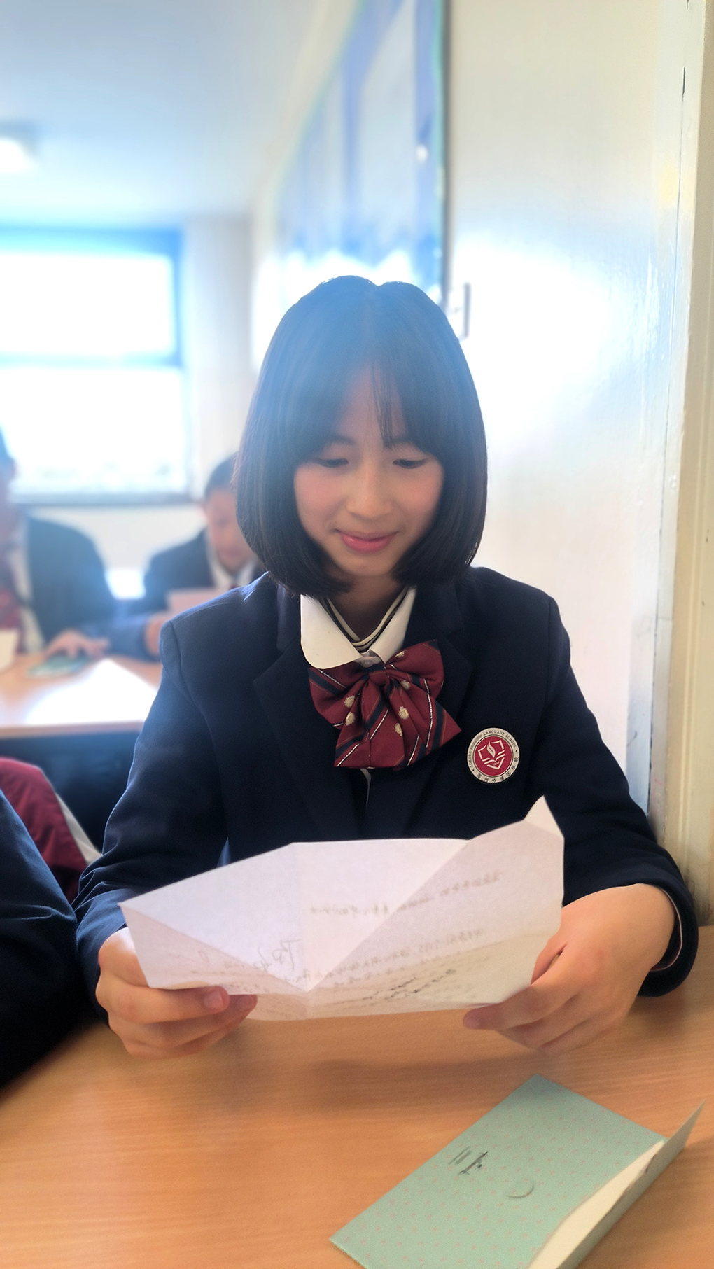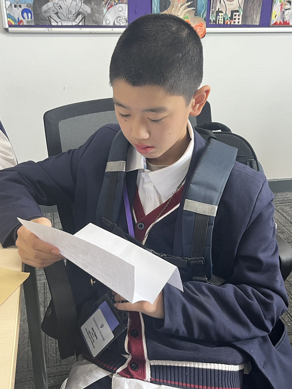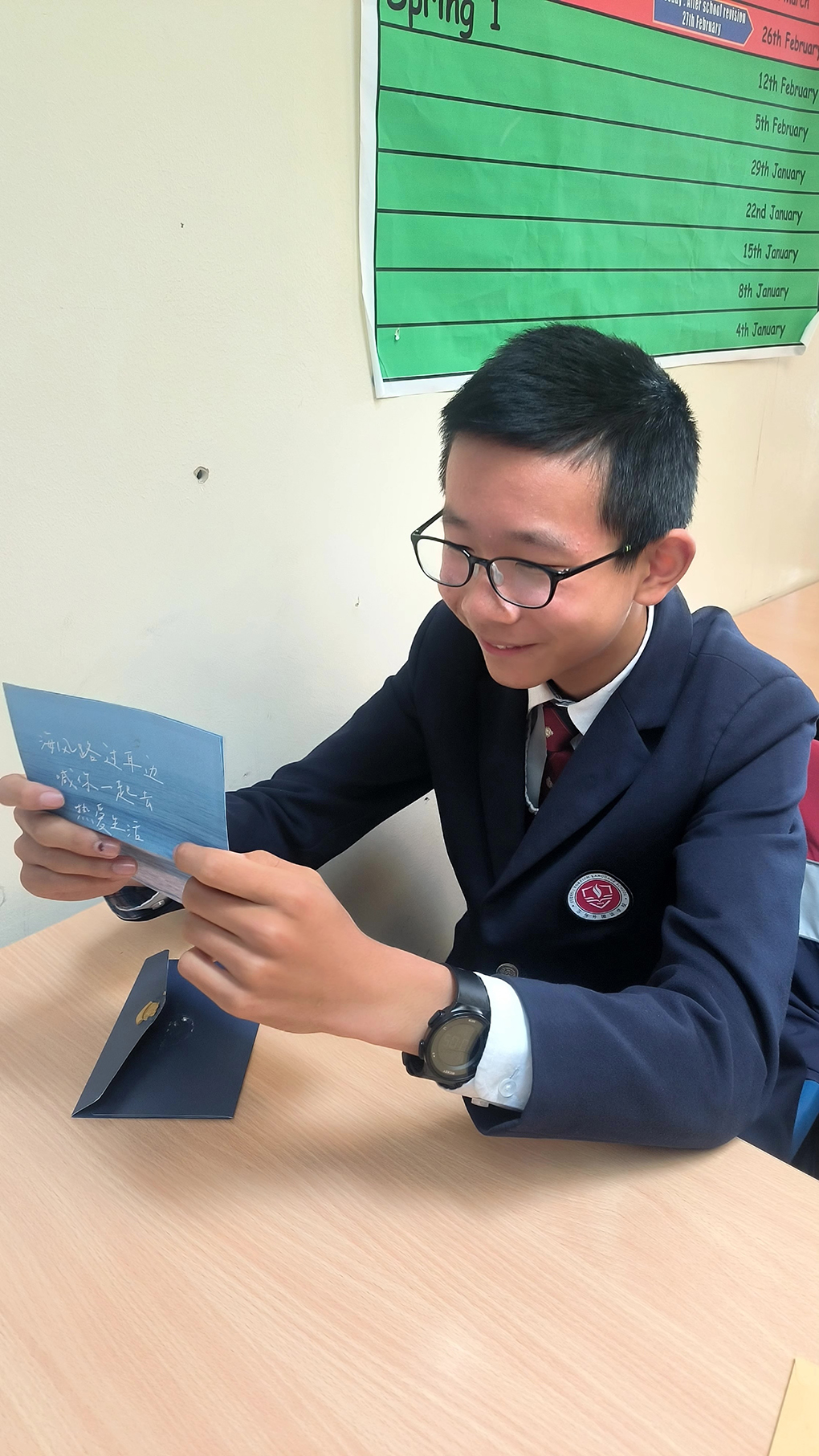 刘裔君写到:校长的访问即将结束,在告别的那一刻,校长微笑着,用他那宽厚的手掌轻拍着我们的肩膀,他鼓励我们要坚强,要自信,无论在哪里,都要记得自己是一名有责任、有担当的世界公民。校长的探望是学校对我们的关心与支持,也让我深刻体会到了学校的国际视野与育人情怀。