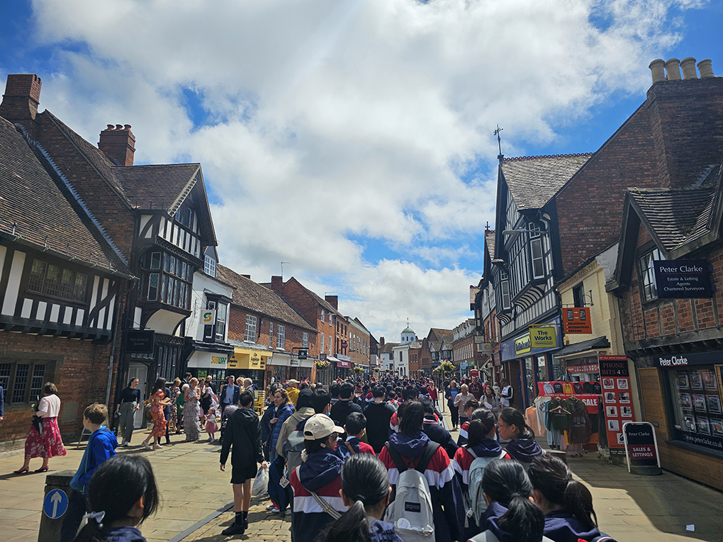 通往斯特拉福的巴车上,同学们的兴奋之情都溢于言表。我也饶有兴致地欣赏窗外的风景。到了目的地,天空下起了一点小雨,我们知道这里也是莎士比亚坟墓的所在地,这时候我们心中五味杂陈。我们先是到了莎士比亚的纪念馆,门口的长队也体现了莎士比亚的威望。纪念馆里昏暗的灯光也引出了那段厚重的历史。看到莎士比亚写作的桌子时,我们都怀着敬畏的心情,仿佛在上面看出了浓重的文化气息,令我们肃然起敬。之后,我们又欣赏了由专业演员和小小志愿者带来的精彩纷呈的话剧表演。演员的神态和动作都能看出他们经历了刻苦训练,充分的代入了人物的情感。我也看的目不转睛。转眼间,我们来到了一片空地。周围有很多丰富的店铺。在观察橱窗里琳琅满目的商品时,我们也有幸遇见了艺人的表演。只见他拿出了一个色彩鲜艳的空竹,熟练地耍着,给我们带来了极强的视觉体验。我们又去了葬着莎士比亚的圣三一教堂。里面的氛围庄严肃穆,没有一个人脸上不露出严肃的表情的。出了教堂,我们又看见了密密麻麻的墓碑。每一块都承载着他们独有的回忆。在长达一个小时的Citywalk中,我们也领略了这个文化小镇的魅力。街头的人们都驻足观赏艺人们的表演。有的唱歌,有的弹奏乐器,无处不在散发迷人的气息。他们潇洒不羁,对未来充满了期望。我们也想像他们一样,自由自在,不受他人的束缚。