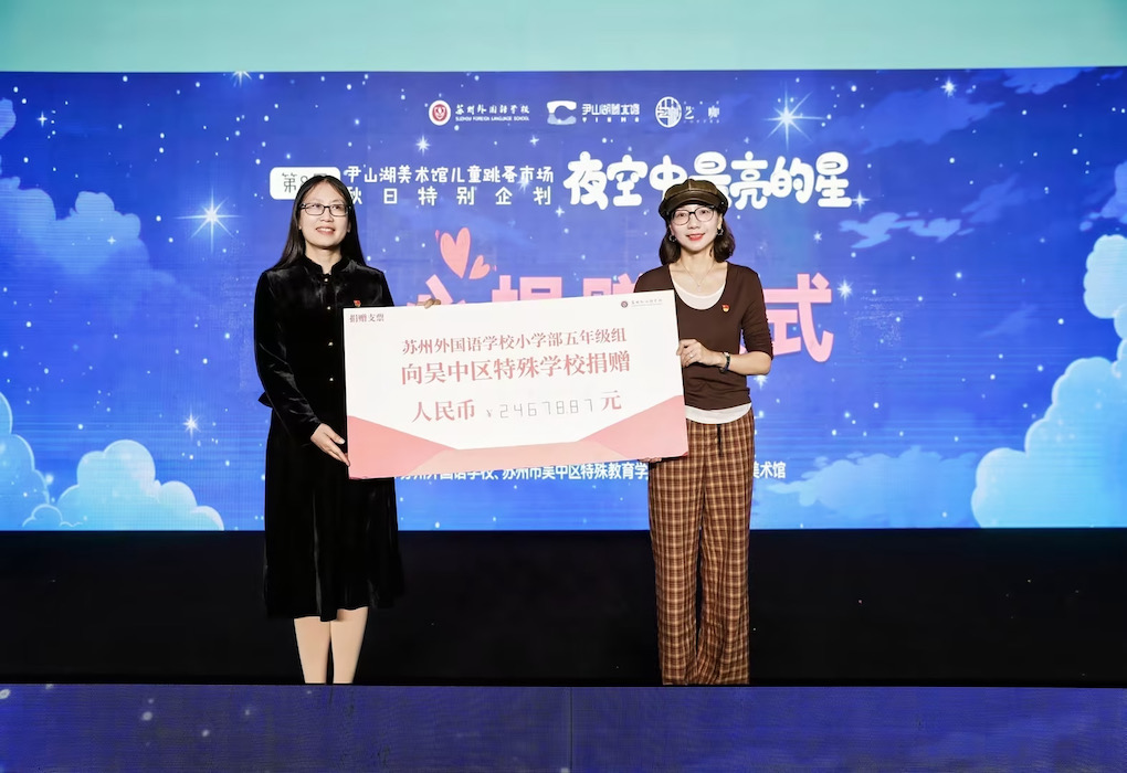 拍卖会结束后,经工作人员统计。今日所有善款,包含儿童跳蚤市场售卖收入,爱心拍卖会所有拍品收入,以及来自苏州市外国语学校捐款,总计24678.87元。由秦菊芳老师代表小学部五年级组所有爱心小伙伴捐赠,助力这些“来自星星的孩子们”健康、快乐成长。