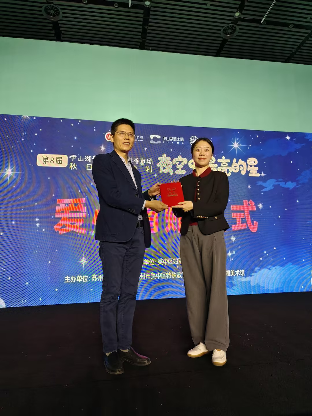 吴中区妇联主席张婷婷女士向苏州外国语学校颁发捐赠证书,感谢苏州外国语学校的爱心善举。吴中区妇联副主席浦益峰女士、苏外教导处主任蔡杰先生、苏外教导处主任助理陈本洪女士、苏外工会主席夏明花女士、尹山湖美术馆馆长朱金风女士、尹山湖美术馆副馆长王黎女士分别向苏州外国语学校五年级各班学生代表颁发社会实践证明,对这些在本次活动中踊跃参与的小朋友们表示赞扬。
