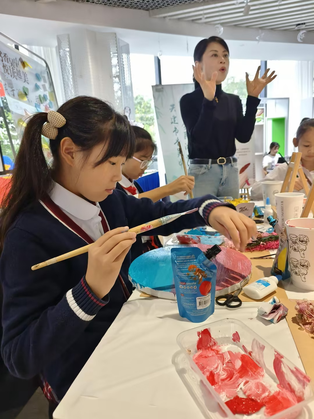 有这样一群特殊的小朋友,他们宛如折翼天使,或许身体有些许障碍,但他们有着和我们一样明亮的眼眸,他们与我们一样渴求知识,渴求健康成长。来自五年级组的刘子桐、虞奕菲、冯秦朗等小朋友,携手这群特殊儿童,以极大的耐心和爱心带着自闭症儿童一起作画。他们用明亮的色调构图,他们在画布上粘上形态各异的彩色永生花,形成一件件永生花油画油画作品。
