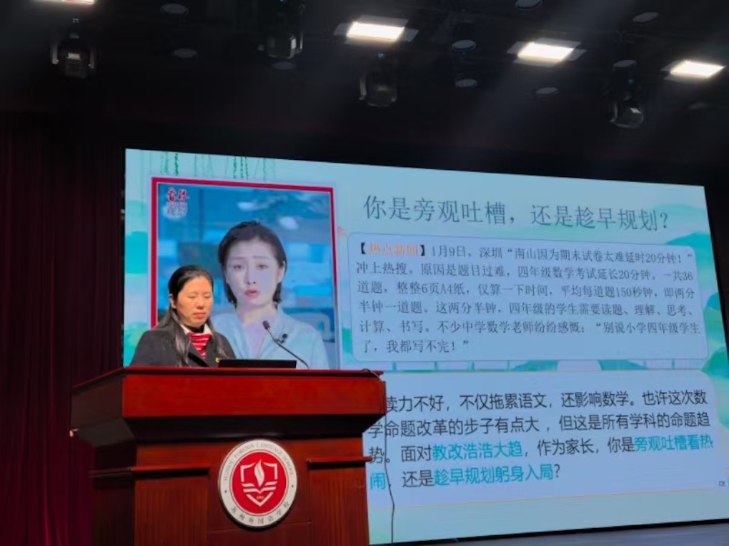 随后,各科老师围绕本学期教学重点与特色活动展开介绍。英语学科详解了听说读写综合能力的提升路径、学习重难点,并结合剑桥考级目标,规划了“国际文化节”与“英语演讲比赛”,强化实践运用。语文学科聚焦虚实结合的教学理念:通过课外阅读、口语交际和个人创作激发潜能,同时依托课堂交流、语言训练与知识积累夯实基础。数学教学紧扣趋势,把握核心要点,以趣味竞赛和逻辑推理等活动提高学生兴趣,并倡导家校联动,共同解决学习难题。