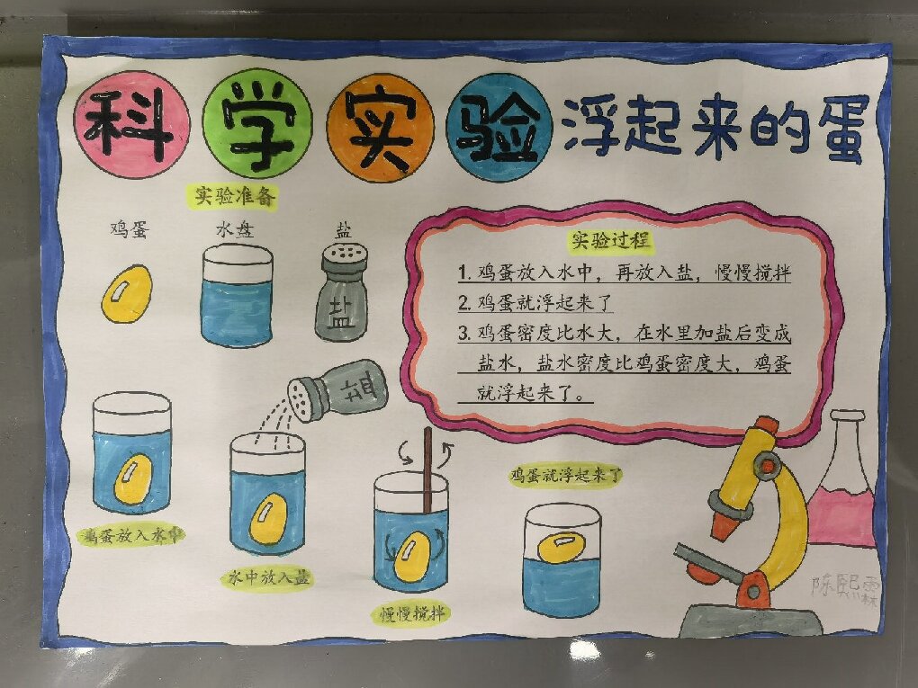 实验结束后,孩子们纷纷翻开作文本,开始撰写观察日记。“10月10日,星期五,晴。今天,我见证了‘鸡蛋的魔法’……”孩子们笔下,不仅具体写下了实验步骤,还记下了自己的心情:“加盐搅拌时,我手都酸了,鸡蛋却一动不动,我有点着急;直到加第五勺盐,它突然往上浮,我高兴得拍了桌子!”