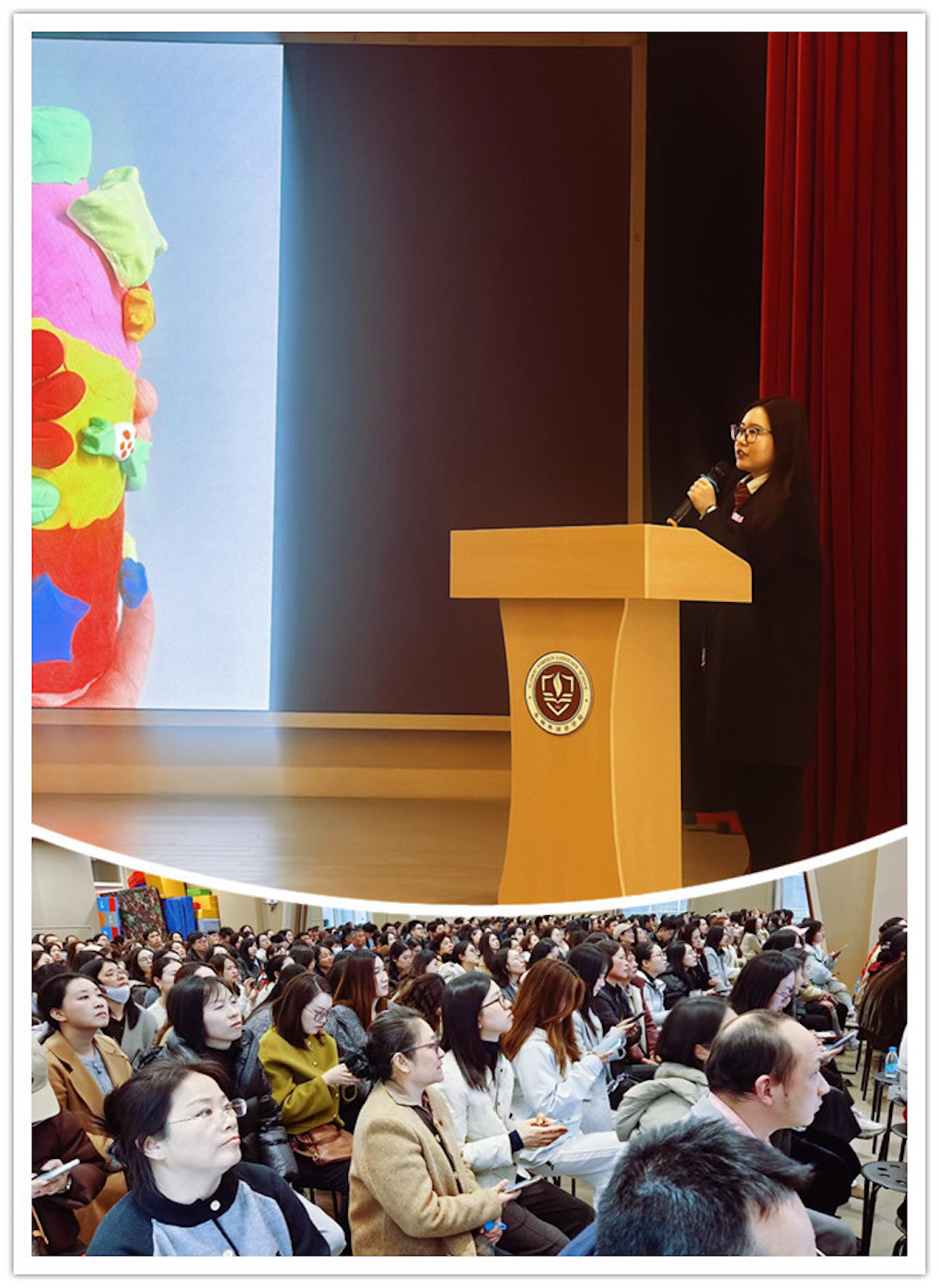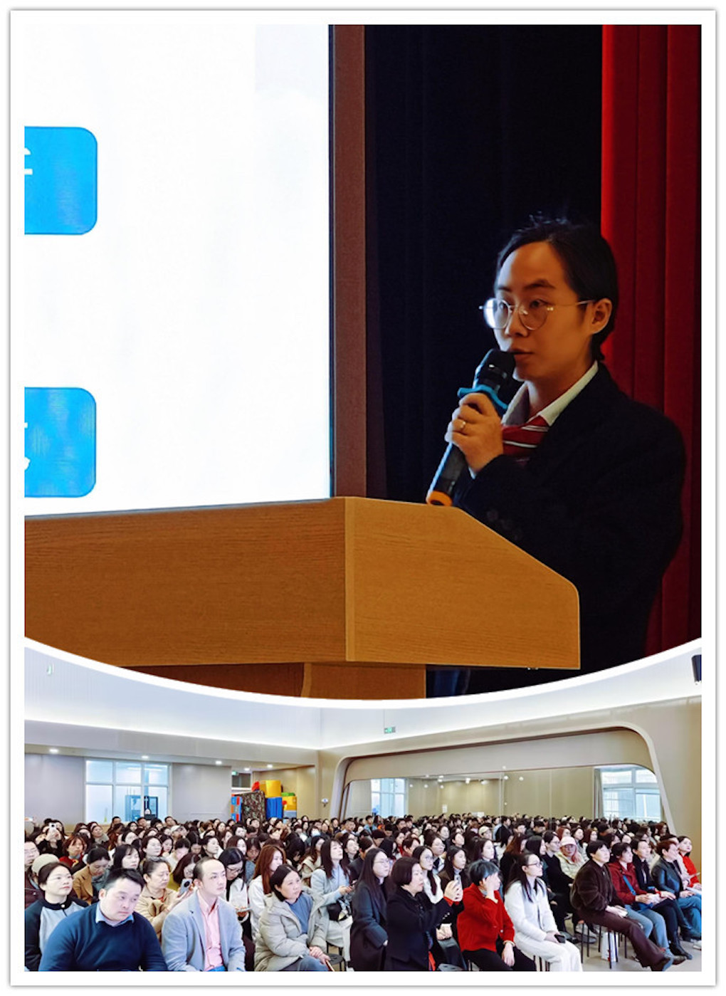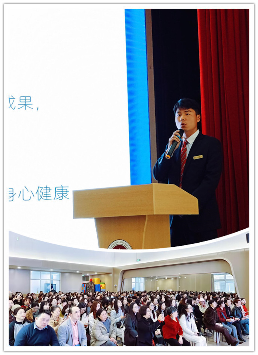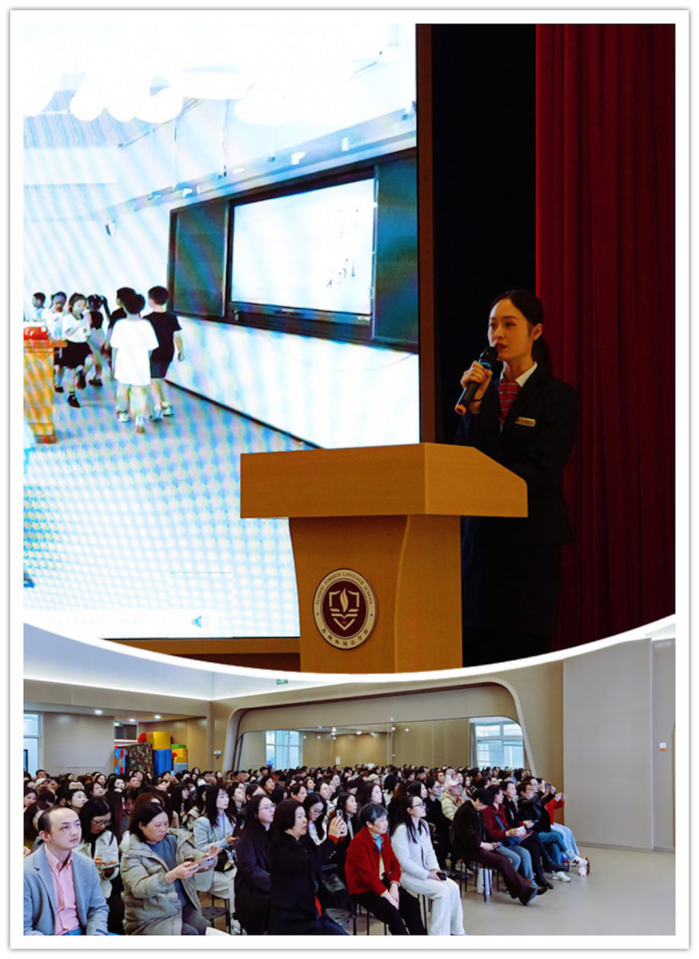 音乐老师以“聆听旋律,表达美好,唤醒艺术天性”为核心进行分享;美术老师则以“以美润心,以画传情,激发创意表达”展开介绍;体育老师以“趣味运动,强健体魄,塑造阳光品格”为主题进行分享,并让学生代表在舞台上给大家展示一些技能,让家长了解如何陪伴孩子成长;科学老师则以“趣味探索,亲近自然,培养科学思维”来介绍教学内容;多语种老师从“趣味启蒙,感知文化,搭建国际沟通桥梁”为核心展开分享。教师特别提醒,家长需放手让孩子自主尝试,允许孩子在实践中犯错,在体验中积累经验,促进身心全面发展。