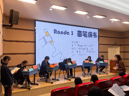 第三轮 “奋笔疾书”,外教的发音刚落,各队选手便在白纸上奋笔疾书。10 个单词,每队都争分夺秒,力求将每一个字母准确无误地写下来。这一刻,白纸成了他们展示西语实力的舞台,笔尖的舞动仿佛在诉说着对西语的热爱。