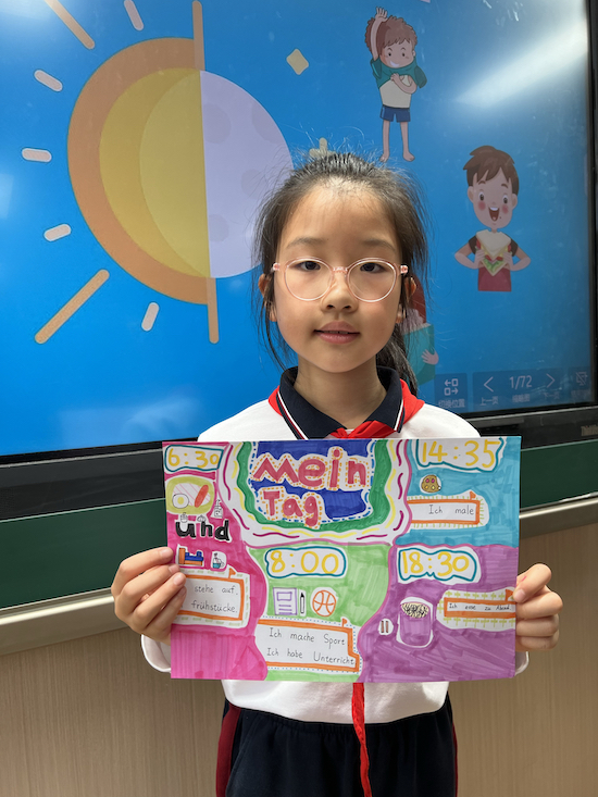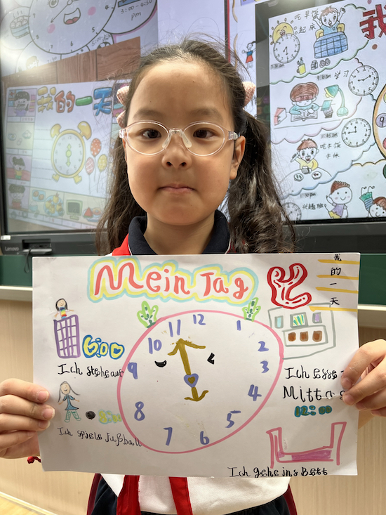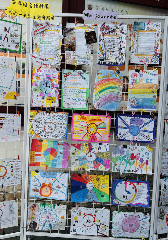 近日,苏州外国语学校三年级的多语种课堂迎来了一场充满童趣与创意的成果展示。在德、西、法、日四门语言课程中,孩子们围绕“我的一天”主题,将语言学习与艺术创作相结合,亲手设计并制作了丰富多彩的多语种主题海报,展现了他们独特的学习成果与无限想象力。