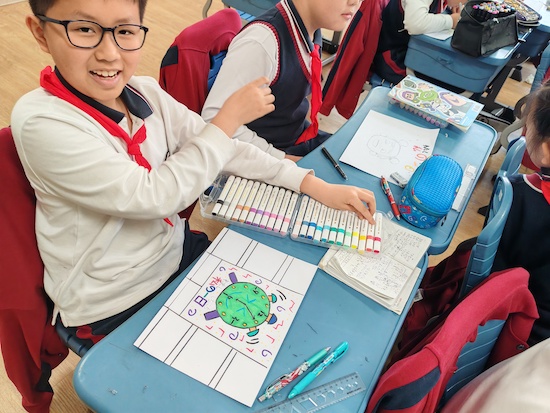 在完成“时间表达”和“一日活动”相关语言知识的学习后,孩子们在老师的指导下展开了一场别开生面的创作实践。他们以手绘时钟为创意核心,巧妙地将自己一天的学习、生活、娱乐等活动用德语、西班牙语、法语、日语四种语言标注出来,并配以生动活泼的插图。有的同学用彩虹色勾勒出24小时时间轴,有的用立体折纸制作可转动的时钟指针,还有的将每日作息与四季变换相结合,创意十足。