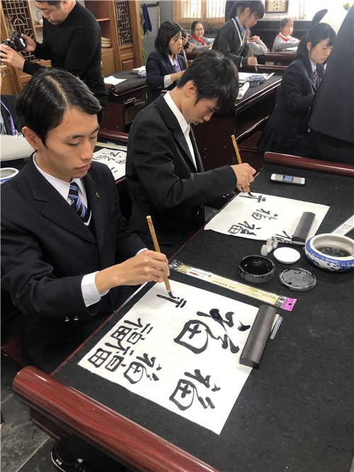 说到书道,中日存在着很多共同点,也能引起更多的共鸣。在这节书道见学课上,日方师生走进古色古香的书法教室,鲜海平老师热情地从仓颉造字的神话到王羲之的兰亭集序介绍了中国书法的发展史,并以福字为例介绍各种字体由古至今的演变历程。最后在老师的指导下日方学生们分别写出了福字的隶书和行书。短短的40分钟的书法课在其乐融融的氛围中圆满结束。