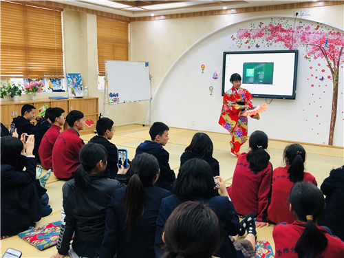 丰富有趣的特色课程体验之后,是令人期待的交流会和欢送会。经过两天的相处早已经非常亲近的中日小伙伴更加轻松自如的交流。在充满了浓浓的和风气息的苏外日语教室里,大家自如地交流着中日文化的不同、相处两天的感受,还各自带来了落落大方的才艺展示。日本女生精心准备的日本传统舞蹈将交流会推向高潮。苏外学生的日语歌曲合唱,轻快的曲调带动全场,最后交流会在苏外同学一曲优美的茉莉花的小提琴演奏中落下了帷幕。
